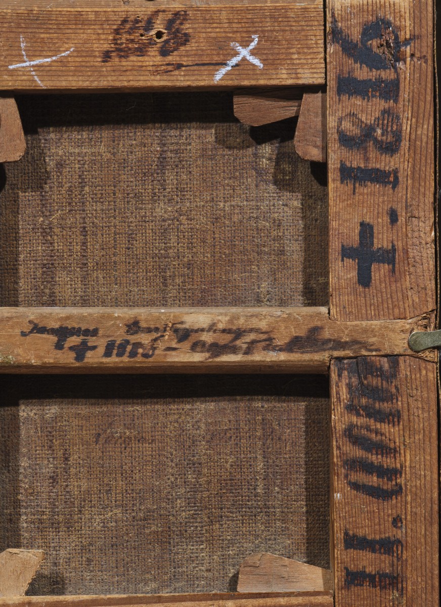 L’identité du modèle était indiquée au dos sur le châssis mais nous n’avons malheureusement pas pu déchiffrer son nom de famille, l’encre ayant fortement bavé sur le châssis. Nous ne connaissons avec certitude que son prénom – Jacques – et la date de son décès : le 11 août 1816. Notre portrait est évidemment antérieur, sans qu’il nous soit possible d’être plus précis sur une datation du fait du côté assez intemporel de sa redingote et de sa coiffure, qui par certains côtés rappelle les perruques de l’Ancien Régime.