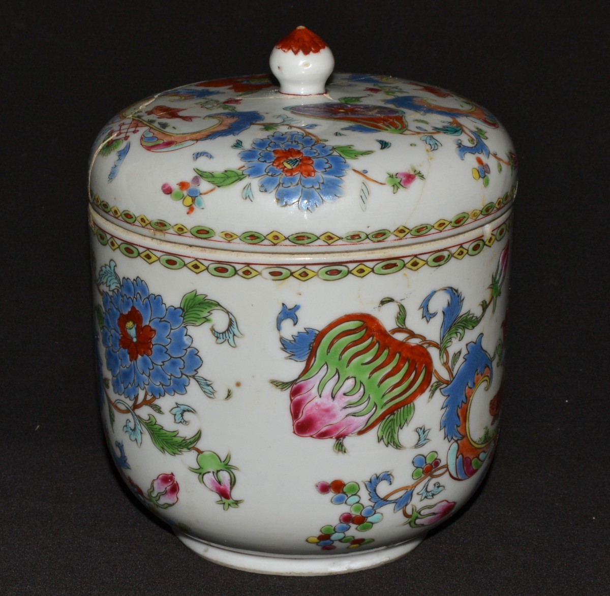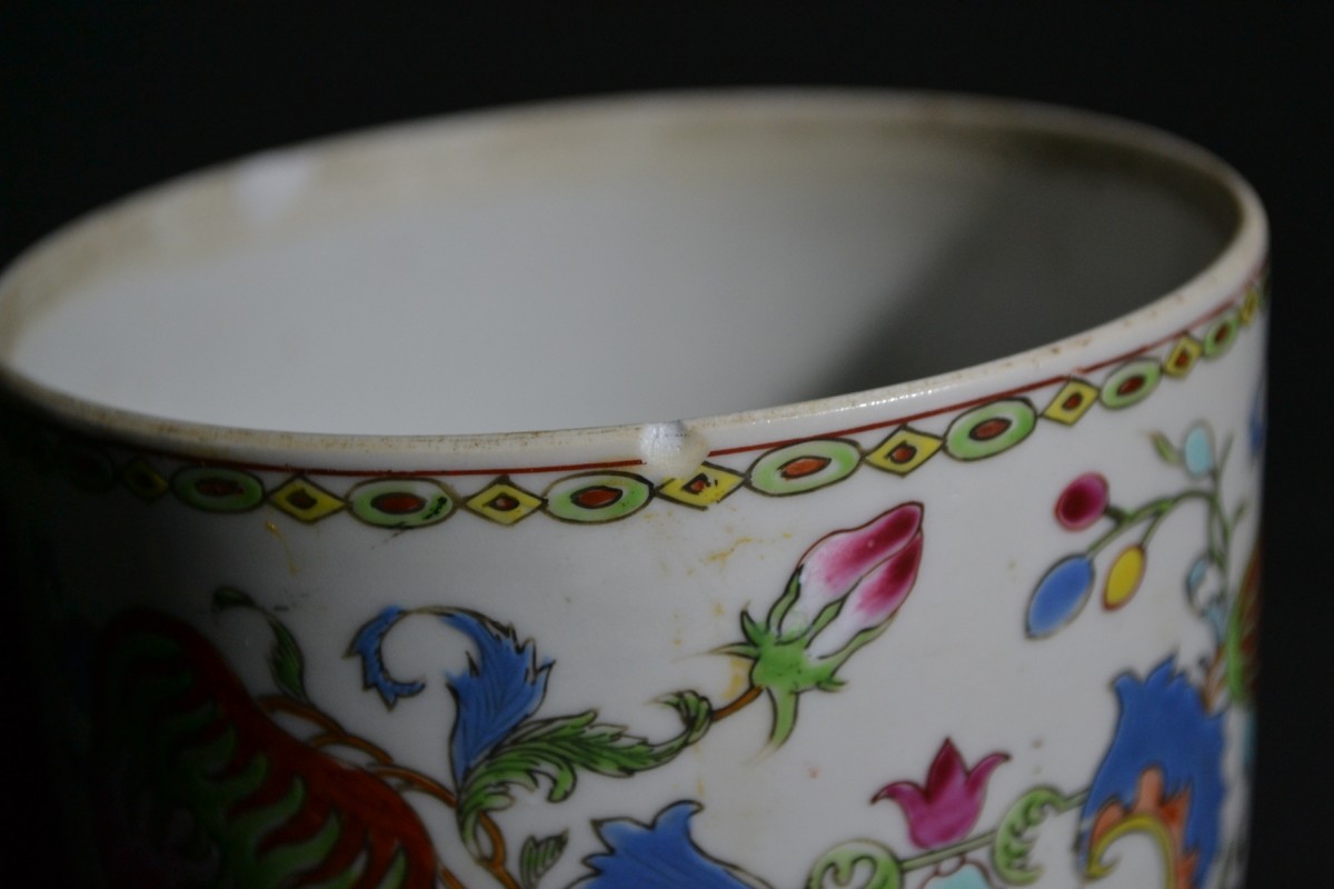 Pot en porcelaine dure, décor émaillé dans le style dit "Pompadour". Chine début du 18°siècle. Couvercle cassé et recollé, pot en bon état sauf 2 éclats visibles en gros plan sur photos. H:150mm D:125mm.