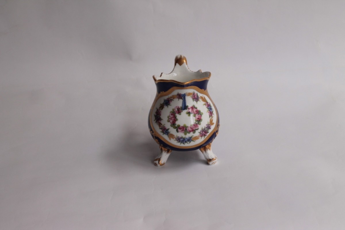 Pot à lait tripode de la première grandeur en porcelaine de Sèvres à décor polychrome de guirlandes de fleurs dans une large réserve encadrée d’un filet or se détachant sur un fond bleu foncé. Grand bandeau or formé de rinceaux et motifs symétriques, frise de feuilles en bas de la panse.