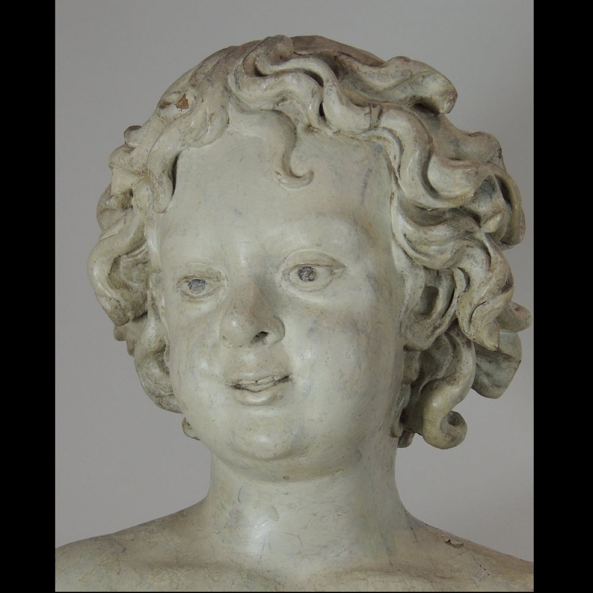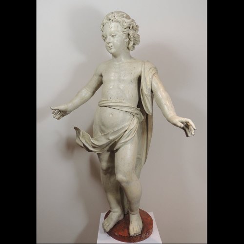Ce grand putto en tilleul est réalisé par un sculpteur italien du XVIIème siècle. Il est peint en blanc à l’imitation du marbre. Un subtil contrapposto, un sourire à peine esquissé, une chevelure bouclée, mais surtout un ensemble très aérien offre une esthétique empruntée à la Renaissance qui se termine à peine. Plus mature que les habituelles représentations de putti, cet amour prend l’apparence d’un pré-adolescent. Malgré des rondeurs, il est empreint d’une grande grâce.