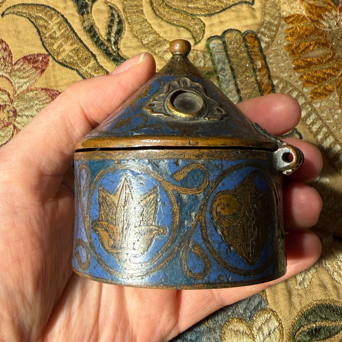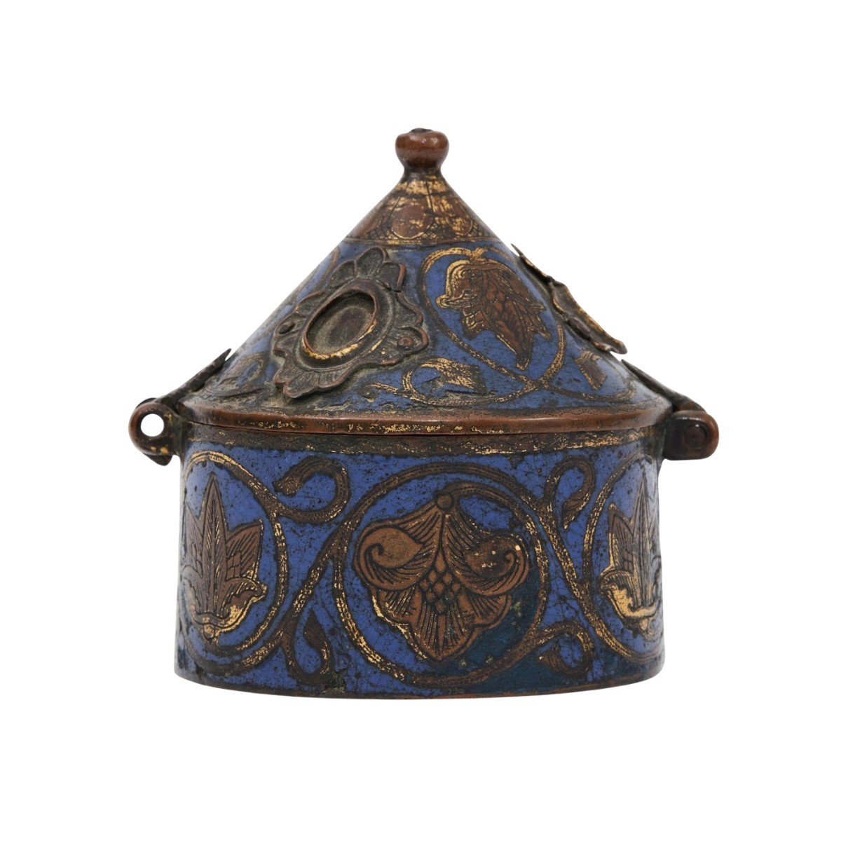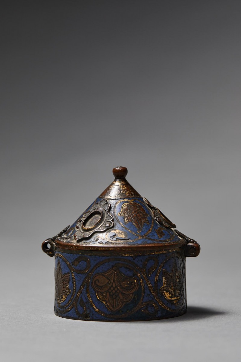 Description : La pyxide, de forme cylindrique, est munie d’un couvercle conique à charnière, surmonté d’un petit bouton. L’extérieur est orné d’un émail champlevé bleu cobalt profond, rehaussé de motifs végétaux gravés disposés en médaillons circulaires. Ces motifs alternent entre palmettes et feuillages, reliés par des rinceaux sinueux qui forment une bande décorative continue autour du corps.