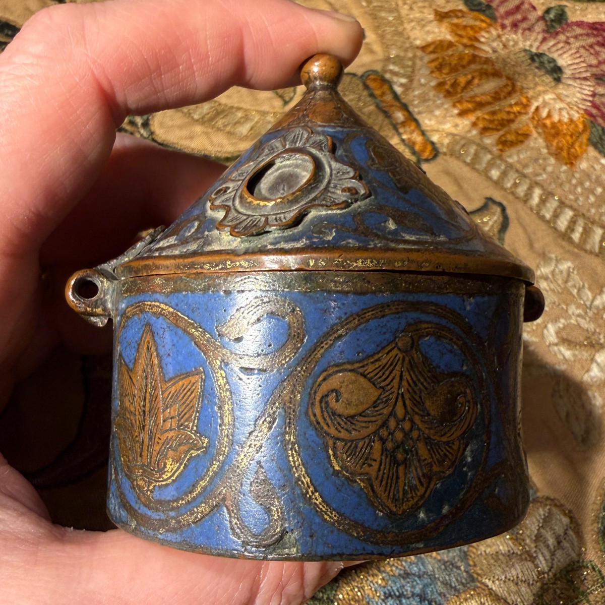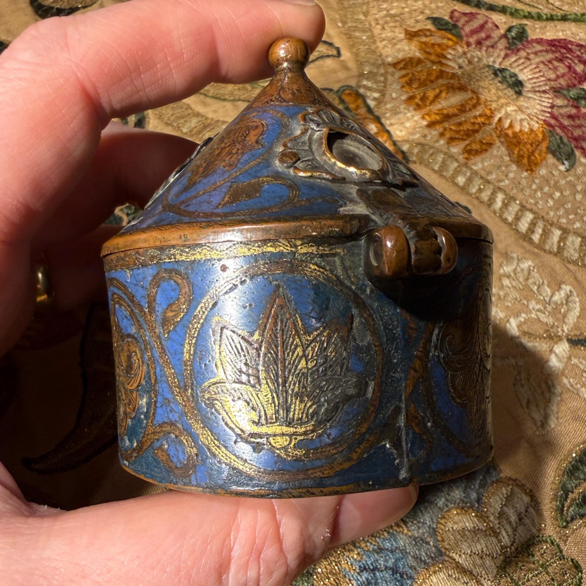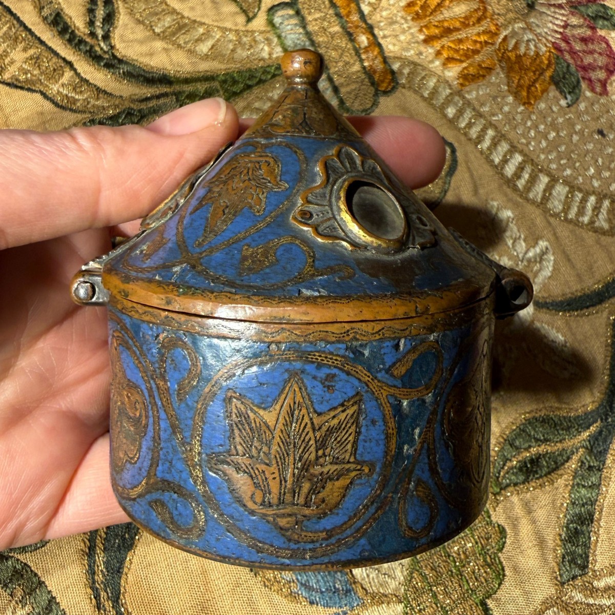 Description : La pyxide, de forme cylindrique, est munie d’un couvercle conique à charnière, surmonté d’un petit bouton. L’extérieur est orné d’un émail champlevé bleu cobalt profond, rehaussé de motifs végétaux gravés disposés en médaillons circulaires. Ces motifs alternent entre palmettes et feuillages, reliés par des rinceaux sinueux qui forment une bande décorative continue autour du corps.