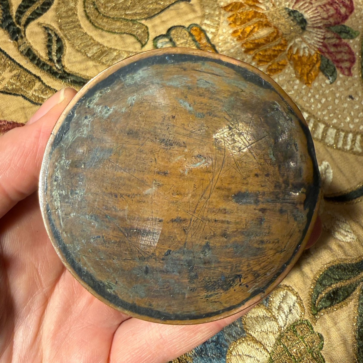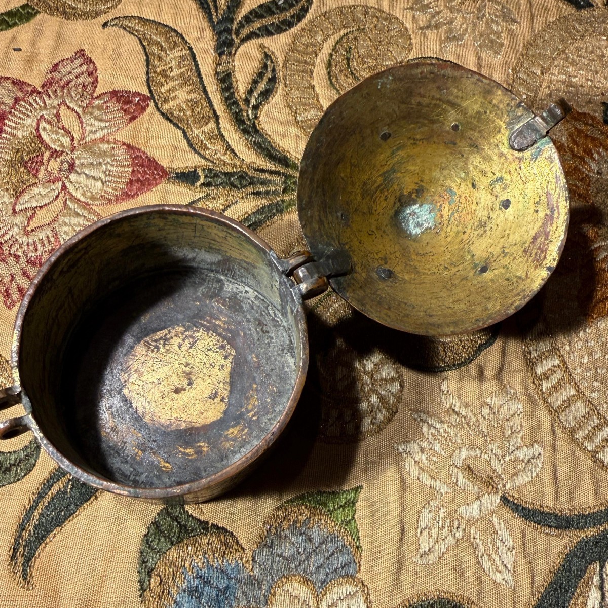 L'intérieur du couvercle et du fond conserve d'importantes traces de dorure à la flamme d'origine, fortement usées par l'usage, avec des abrasions et une oxydation noircie témoignant d'ouvertures et de manipulations répétées. L'extérieur était également entièrement doré à l'origine, mais cette dorure est aujourd'hui en grande partie usée ; des traces subsistent dans les creux gravés et les zones protégées. Le fond présente une usure concentrée au centre, formant une zone circulaire de dorure exposée où reposait l'hostie.