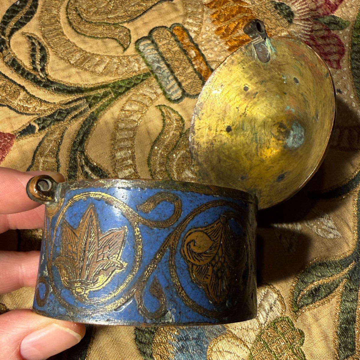Le couvercle est également émaillé et orné de trois montures en cuivre doré, chacune ...
