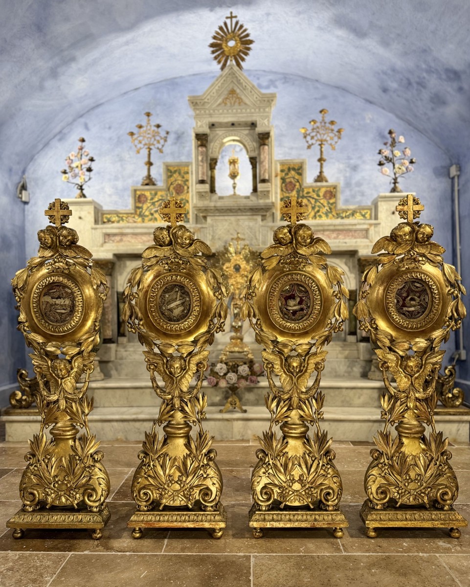 Il est rare de trouver à la vente une série de quatre monstrances et avec plus de 120 cm, il est tout aussi rare de présenter des reliquaires de cette taille. Enfin la présence de reliques ex-ossibus notables constituent encore une curiosité remarquable. Ces trois spécificités et l'ancienneté de cette suite, en font une pièce d'exception.