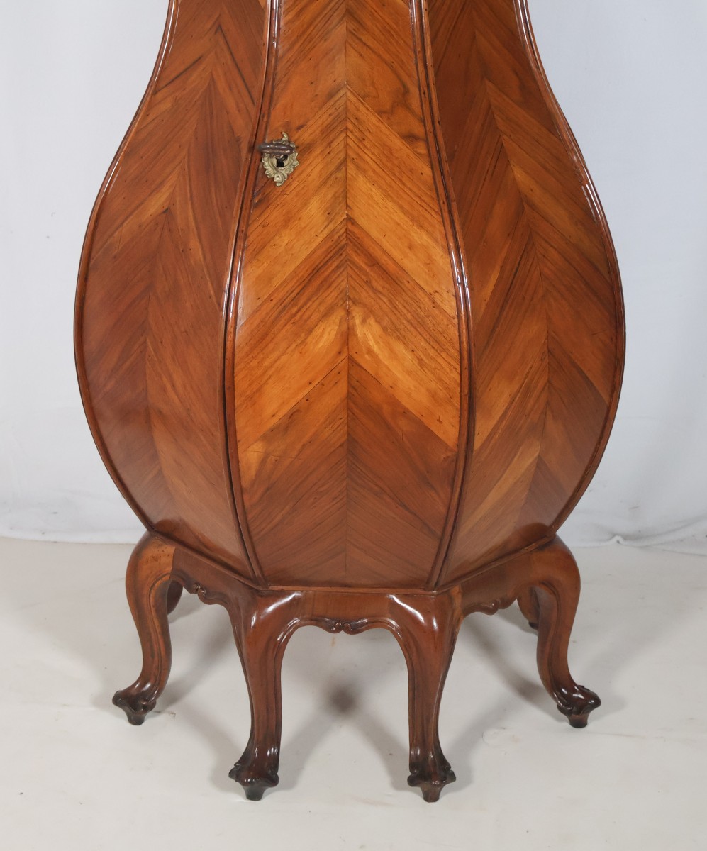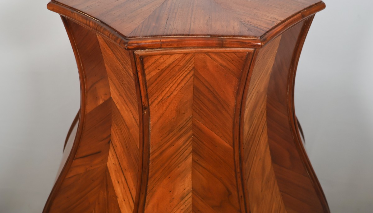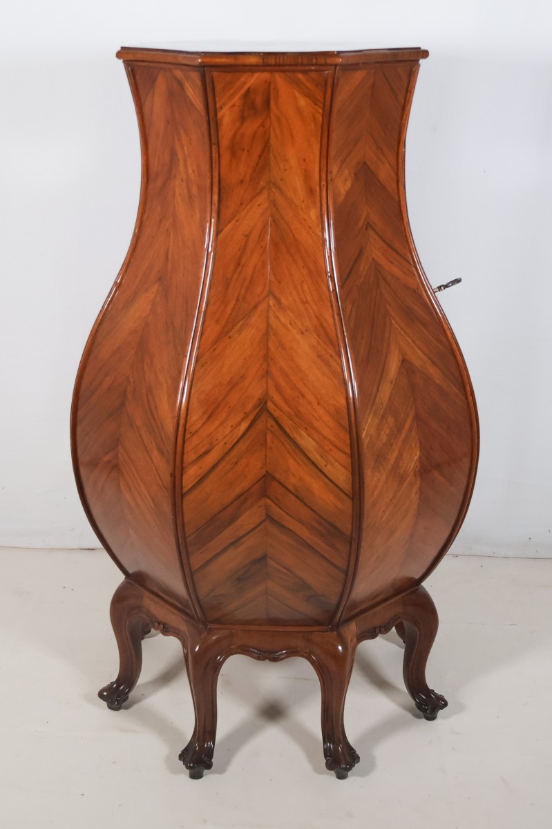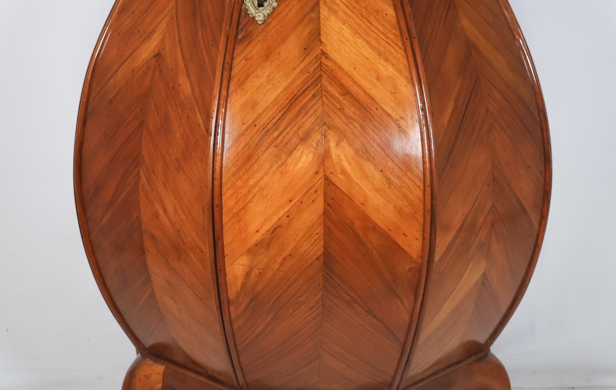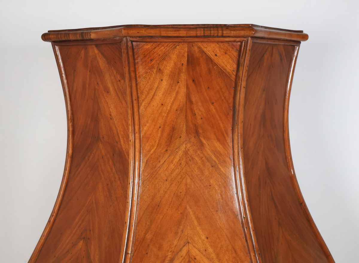 Composé de huit panneaux galbés et moulurés en marqueterie de noyer : placage épais en forme de chevrons.