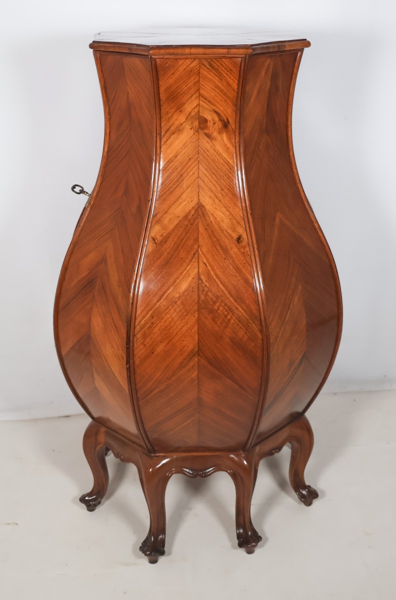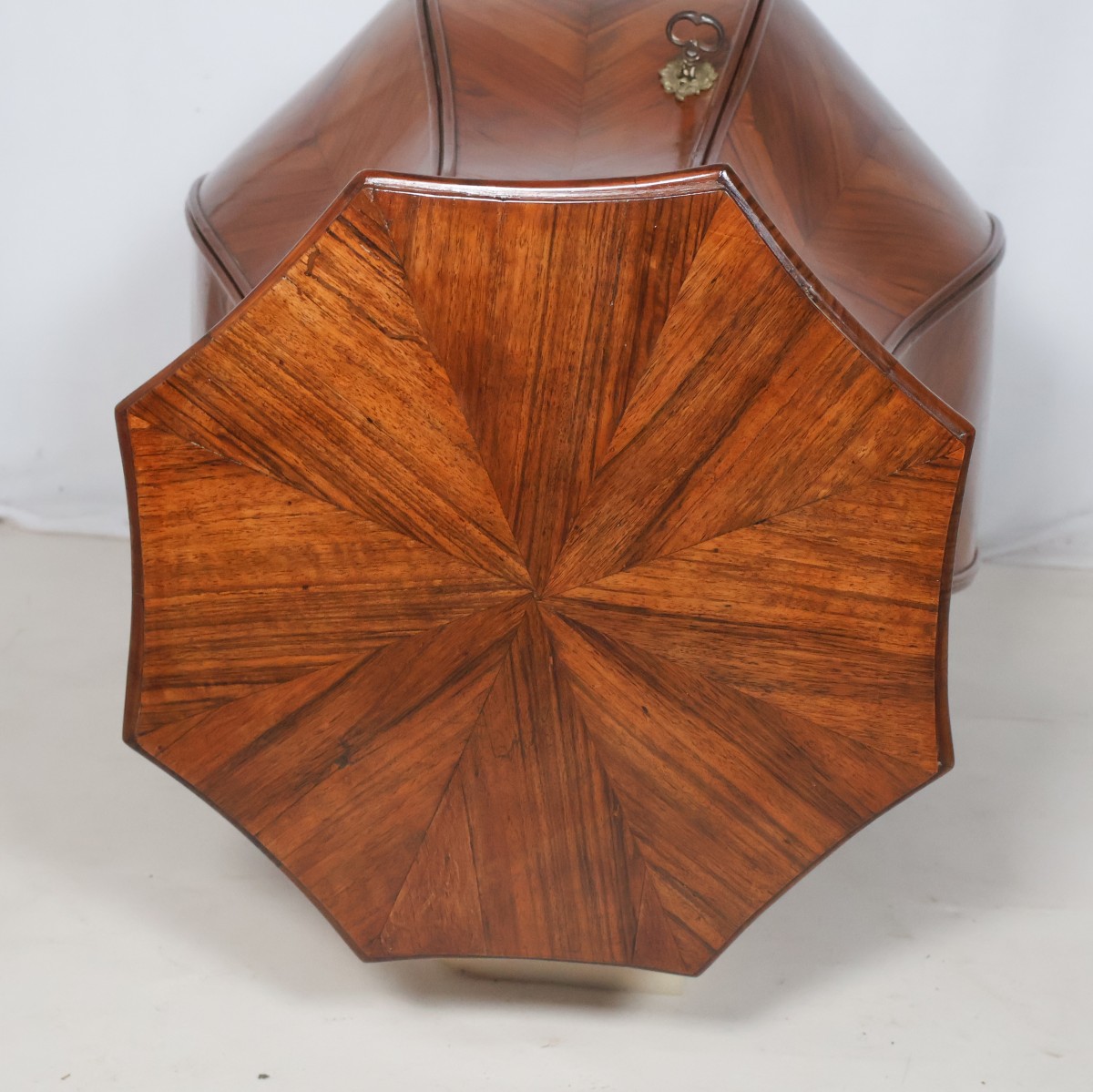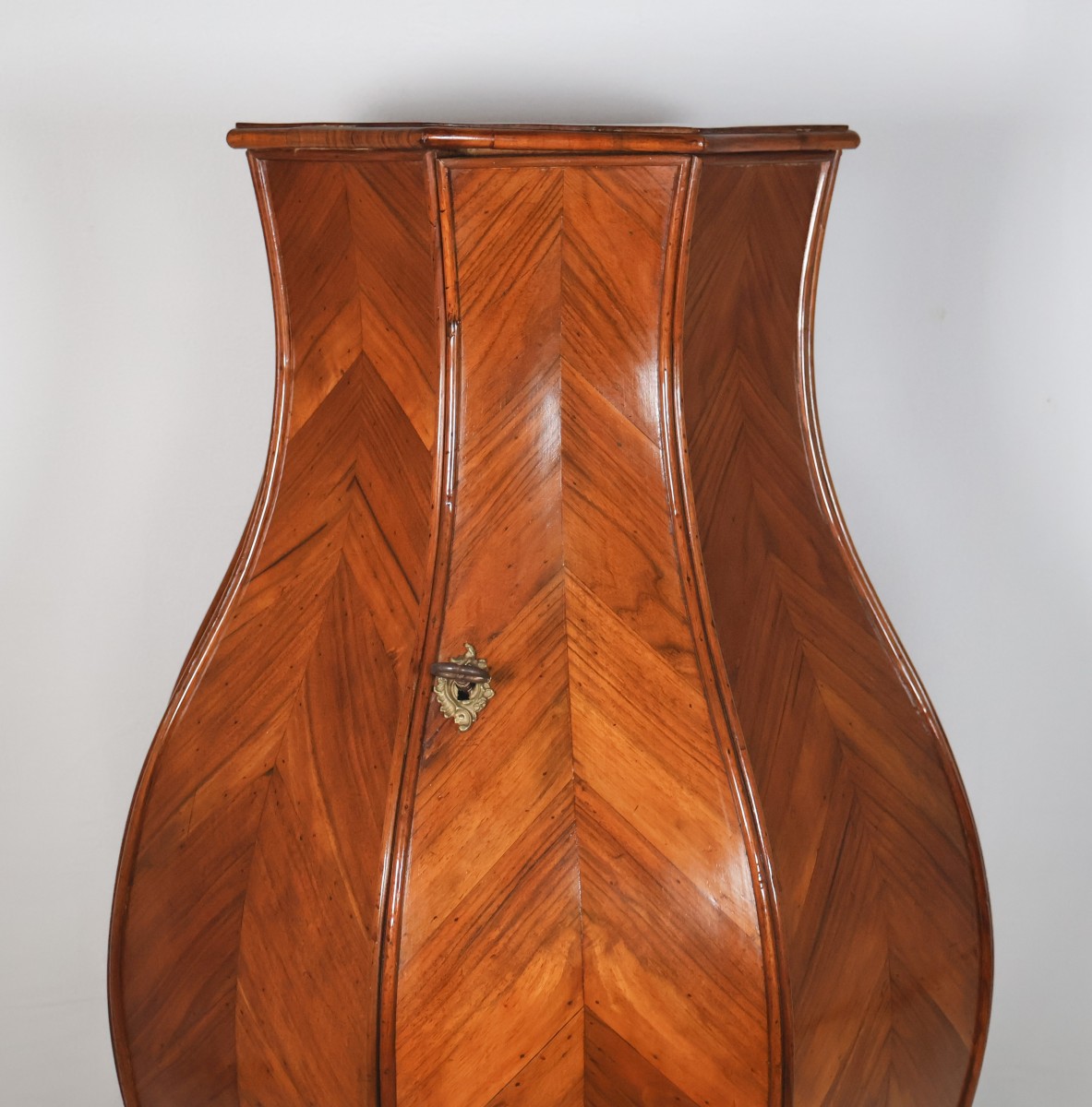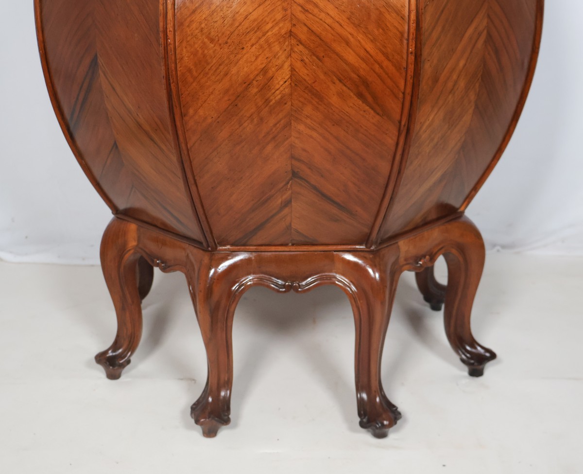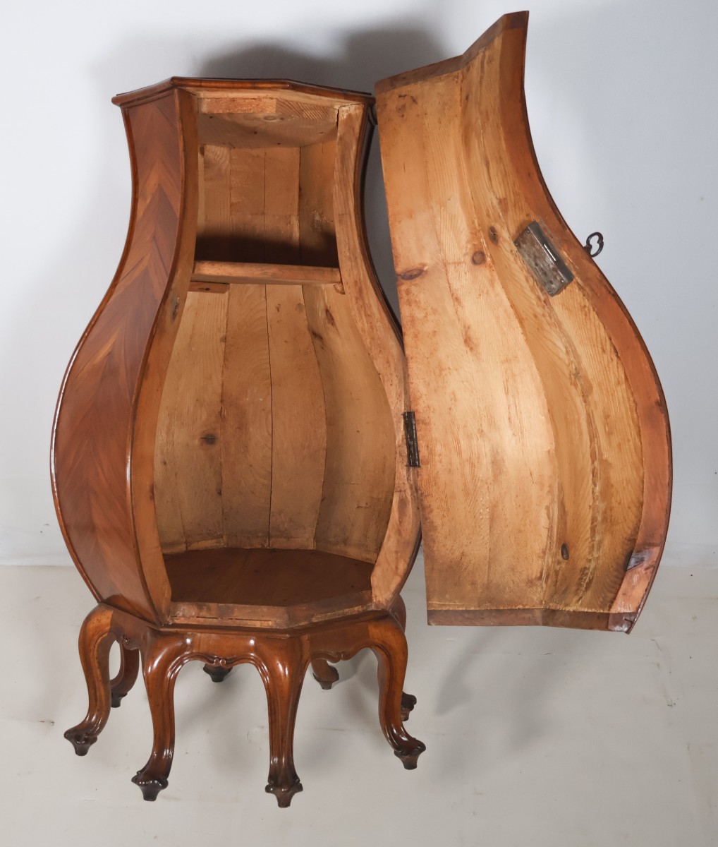 Composé de huit panneaux galbés et moulurés en marqueterie de noyer : placage épais en forme de chevrons.