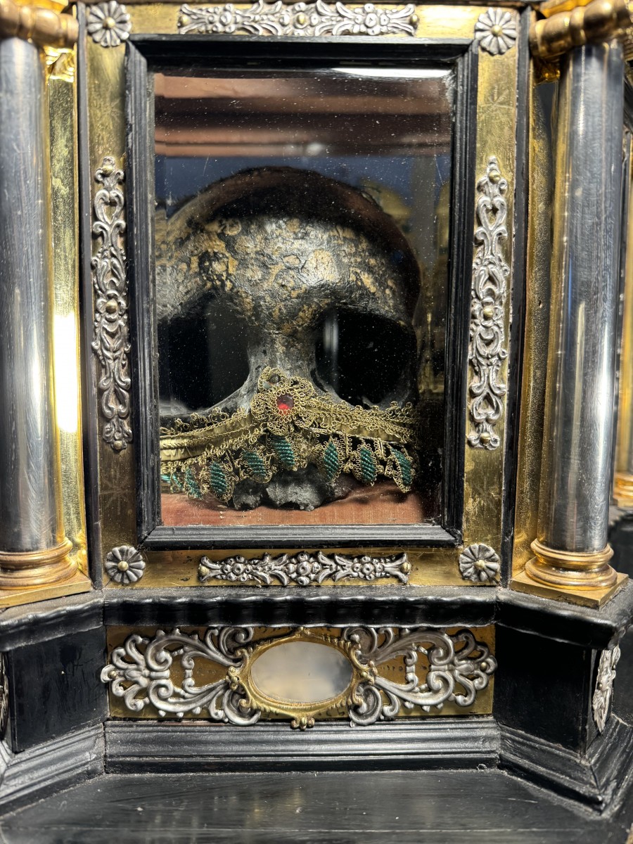 En ébène, argent et cuivre doré de forme architecturée soulignée de quatre colonnes détachées il abrite en effet un chef des onze mille Vierges de la compagnie de Sainte Ursule.