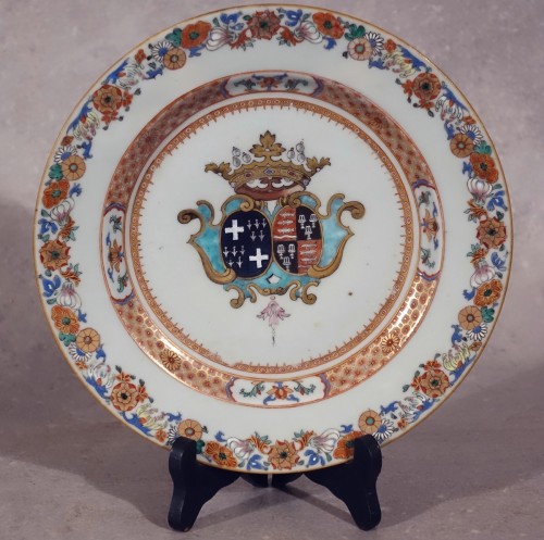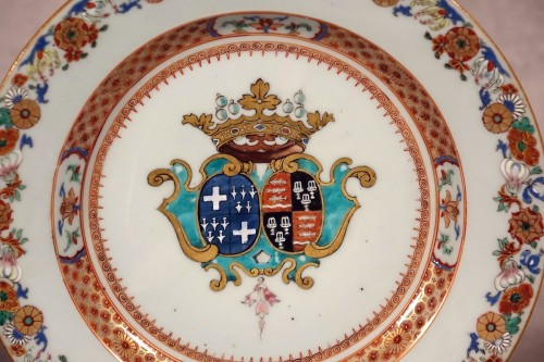 Note : Ces assiettes figurent parmi les plus anciens mais surtout les plus riches modèles armoriés produits pour la Compagnie des Indes.
