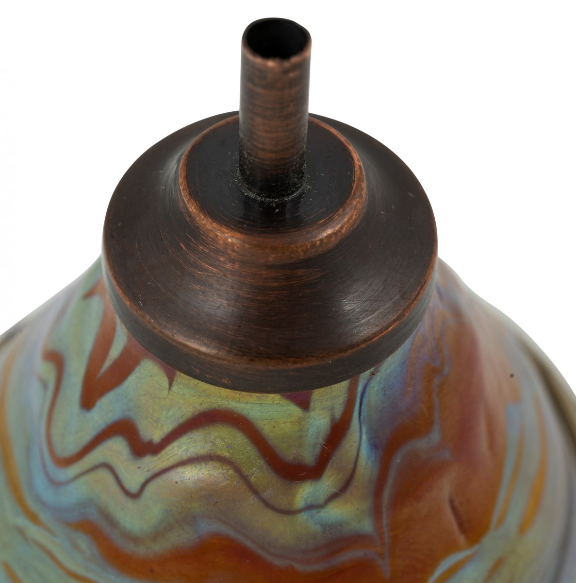 car le public de ces manifestations venait du monde entier. Pour la verrerie Loetz, il s'agissait d'une étape importante dans l'histoire de l'entreprise. Ce récipient à sable buvard est soufflé dans un moule, de forme libre, réduit et irisé, et possède un couvercle en laiton.