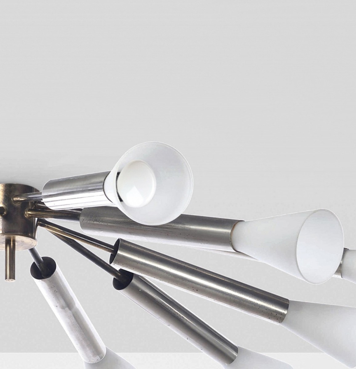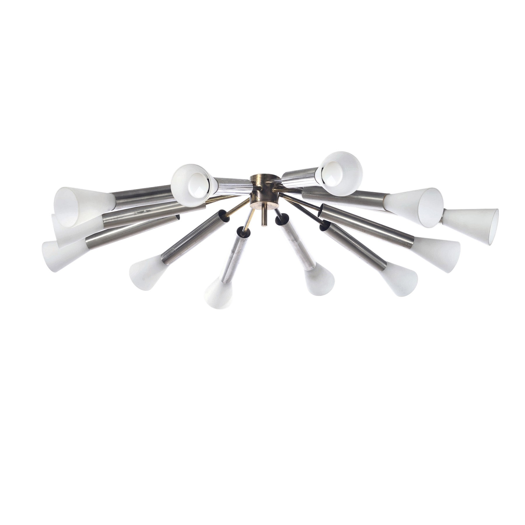 Reggiani, plafonnier, Italie, années 1960, structure en laiton nickelé, diffuseurs coniques en verre blanc lattimo, 25x130 cm
