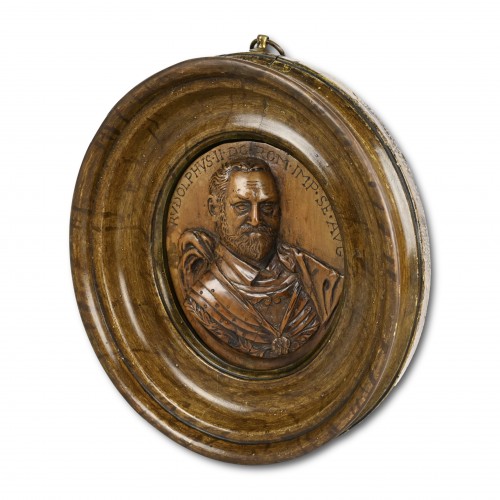 Un relief en bois fruitier encadré de Rodolphe II, empereur du Saint-Empire romain germanique (vers 1552 - 1612).