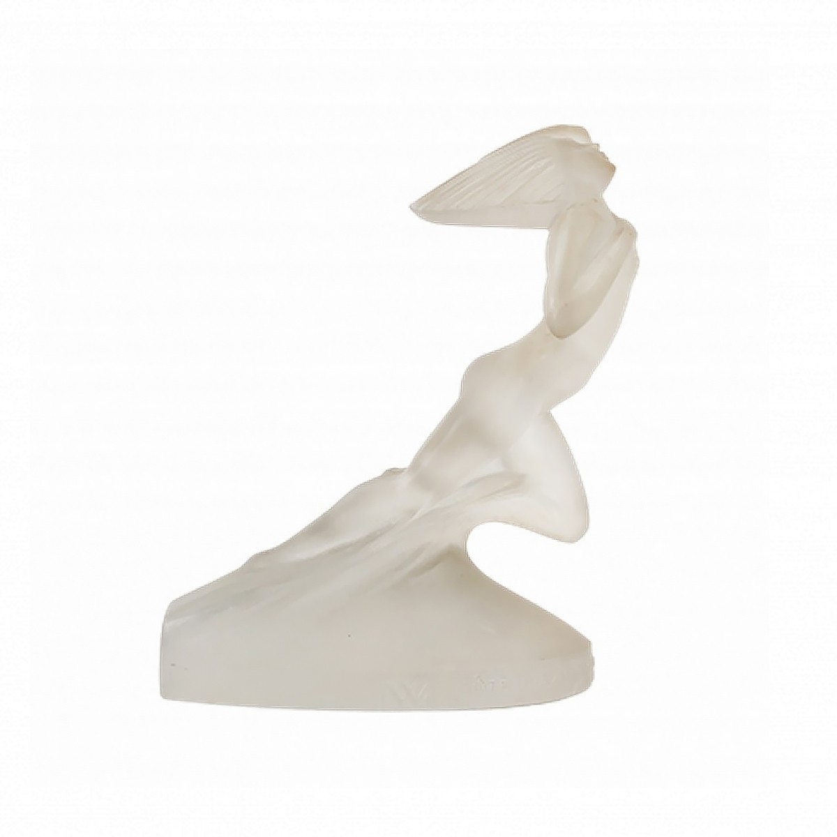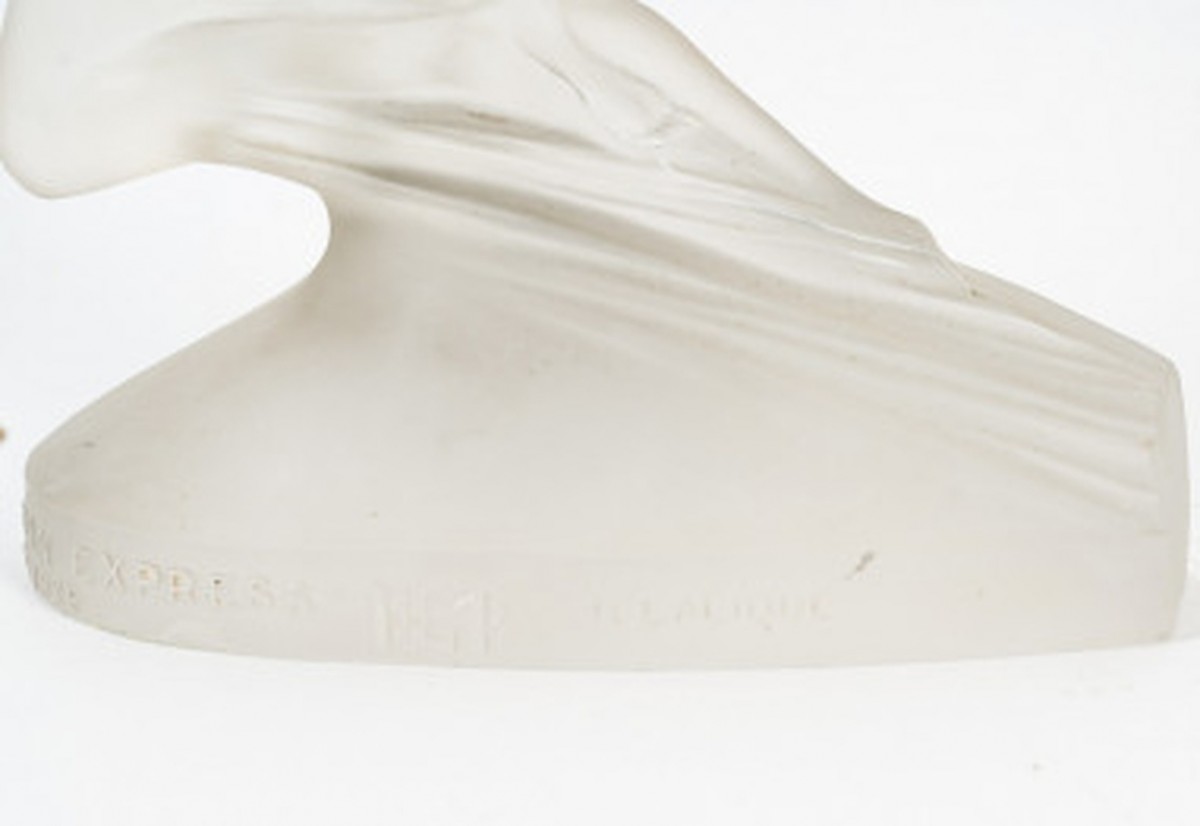 René LALIQUE Statuette "Côte d'Azur" en verre blanc moulé pressé ,modèle créée en 1929.Signature en relief dans le moule .Titrée "CÔTE D'AZUR PULLMAN EXPRESS 9 - DECEMBRE - 1929".La statuette Côté d'Azur a été créée par R.Lalique en verre blanc en 1929 à l'occasion de l'inauguration du train wagon-lits côte d'azur en 1929. Les 500 premiers voyageurs reçurent une statuette titrée Parfait état. hauteur 17 cm par 12,5 cm base Félix Marcilhac, René Lalique, catalogue Raisonné de l'Œuvre de Verre, Les Éditions de l'Amateur, Paris, 2011.