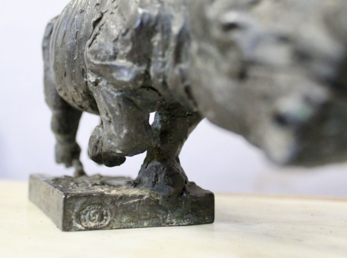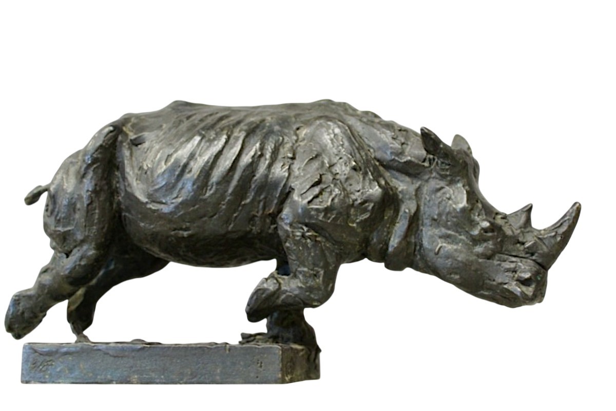 Rhinocéros en bronze patiné, avec cachet du fondeur sur la terrasse et signature.