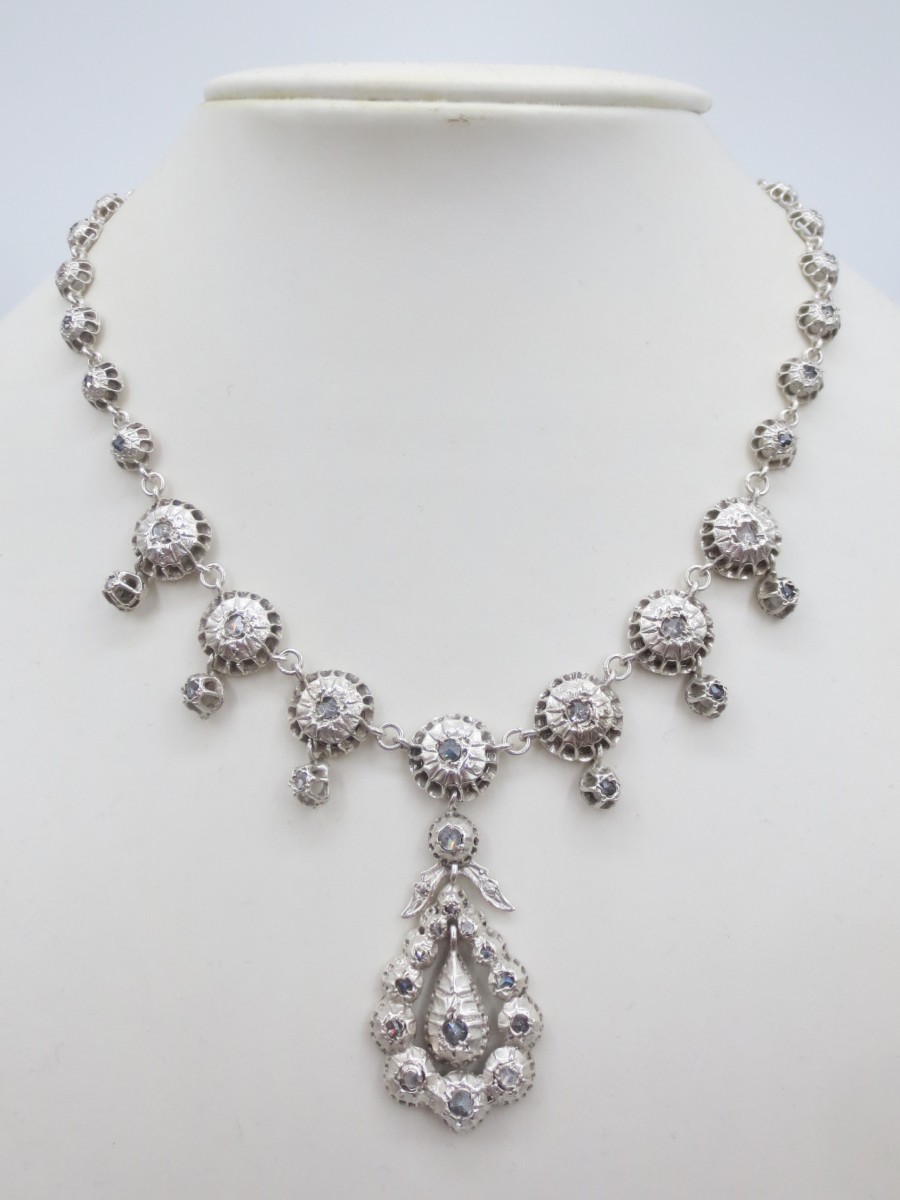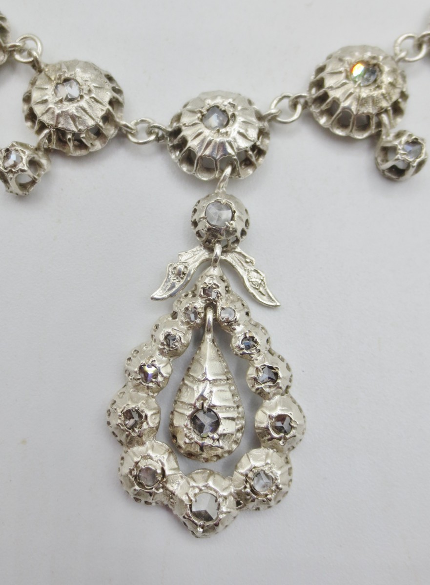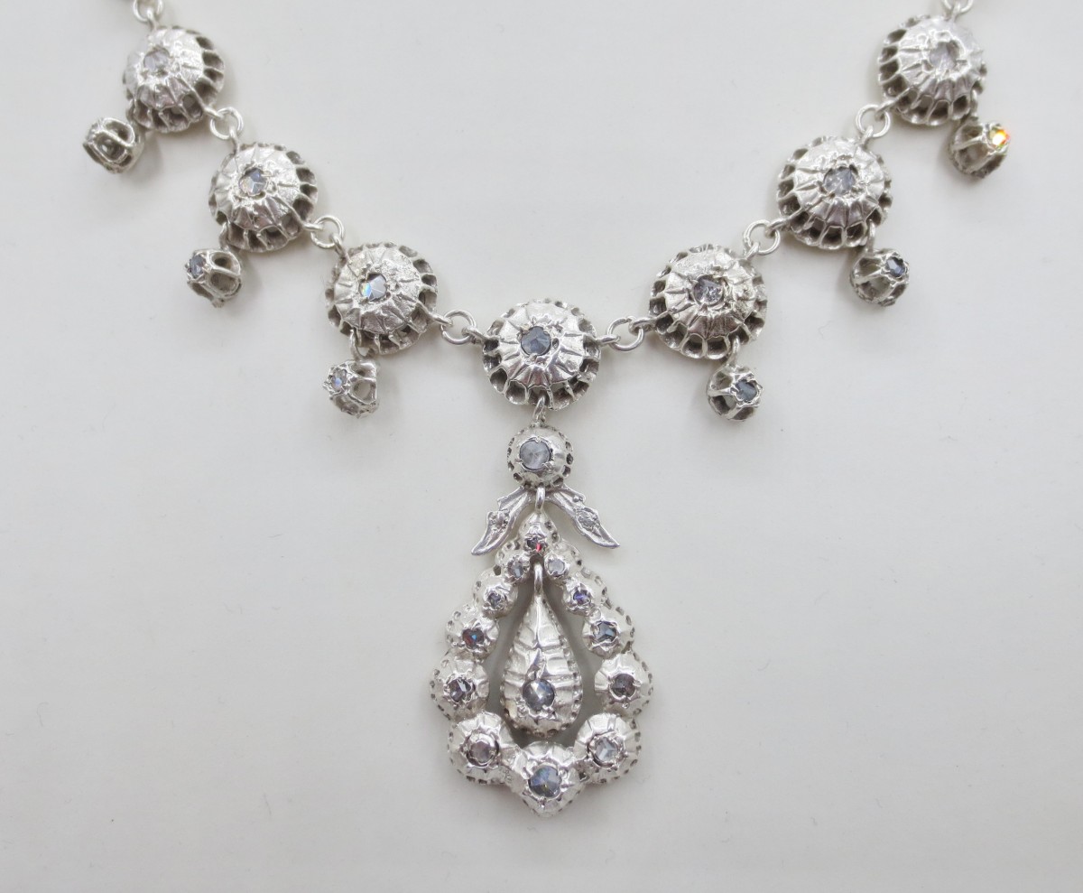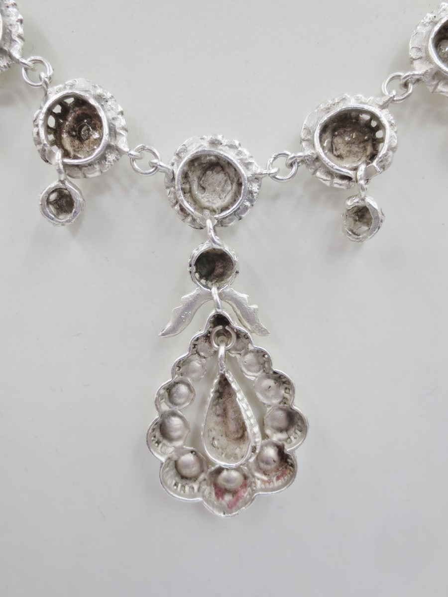 Cette très belle rivière provençale est en argent, agrémentée de pierres du Rhin montées sur clinquant en serti-clos. Bijoux d'apparats pour l' aristocratie, ces colliers inspirés de la production du XVIIIe siècle étaient très appréciés par les avignonnaises et les arlésiennes, ils se rependirent et gagnèrent des classes plus modestes au XIXe siècle.