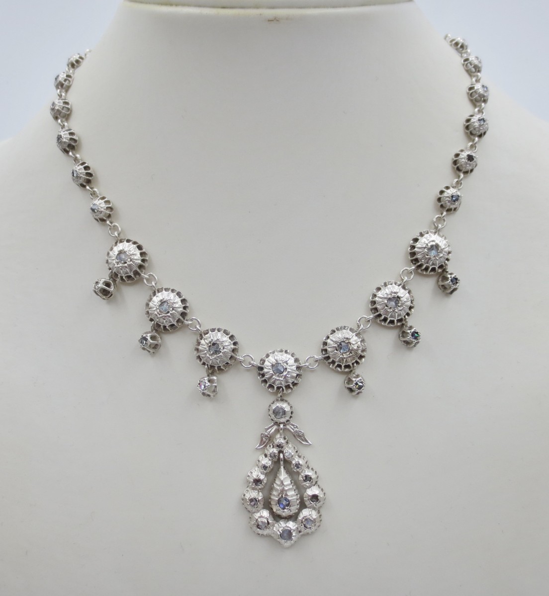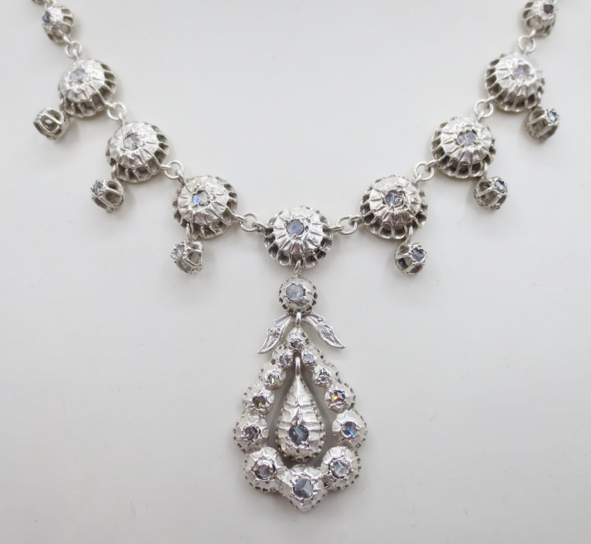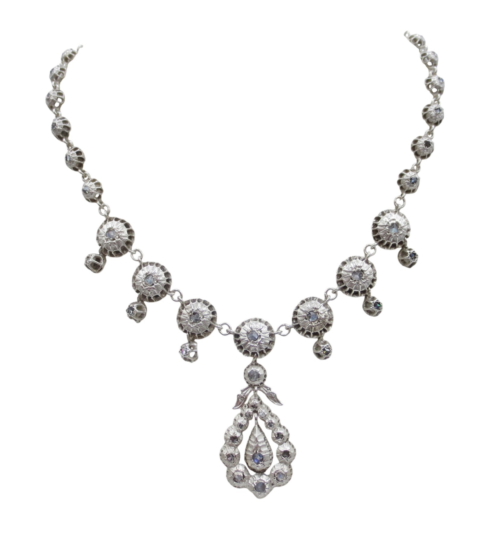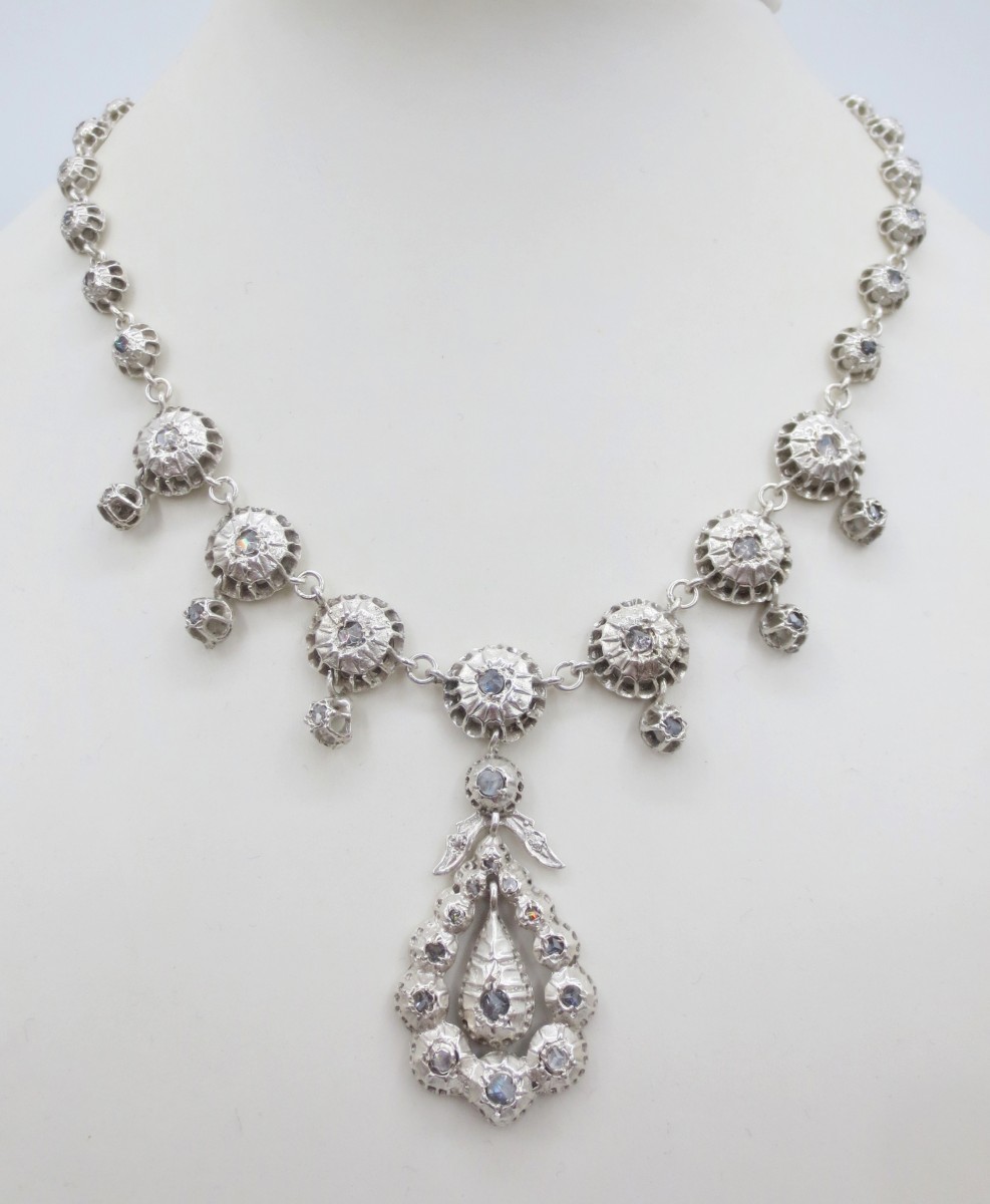 Cette très belle rivière provençale est en argent, agrémentée de pierres du Rhin montées sur clinquant en serti-clos. Bijoux d'apparats pour l' aristocratie, ces colliers inspirés de la production du XVIIIe siècle étaient très appréciés par les avignonnaises et les arlésiennes, ils se rependirent et gagnèrent des classes plus modestes au XIXe siècle.
