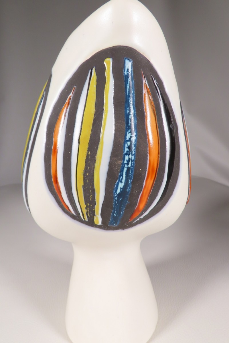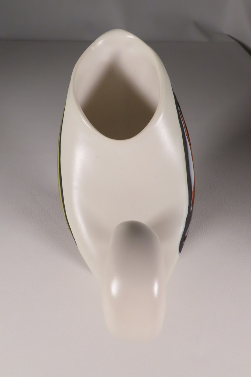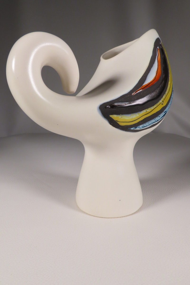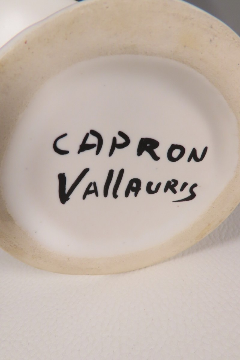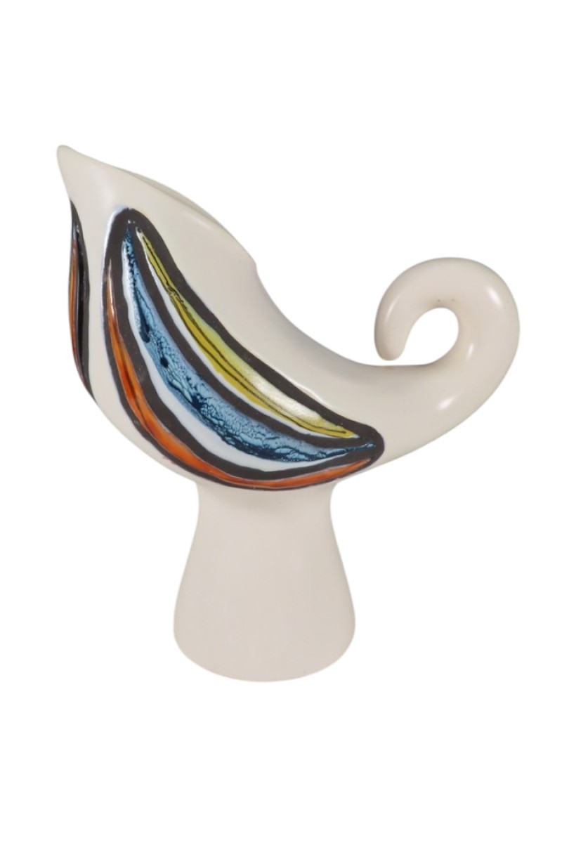 Pichet oiseau en céramique émaillée à décor de plumes stylisées de couleurs jaune, rouge et bleu dans des réserves noires mates sur fond d’émaille blanc laiteux. Ce pichet pour la signature en dessous de Capron Vallauris pour Roger Capron. Pichet en très bel état.