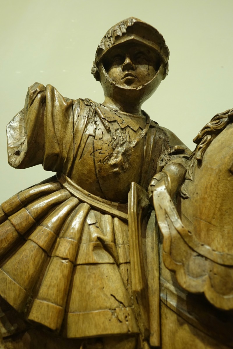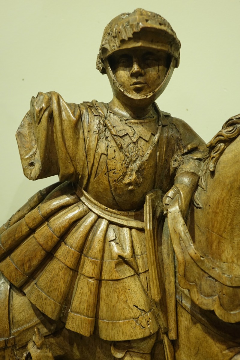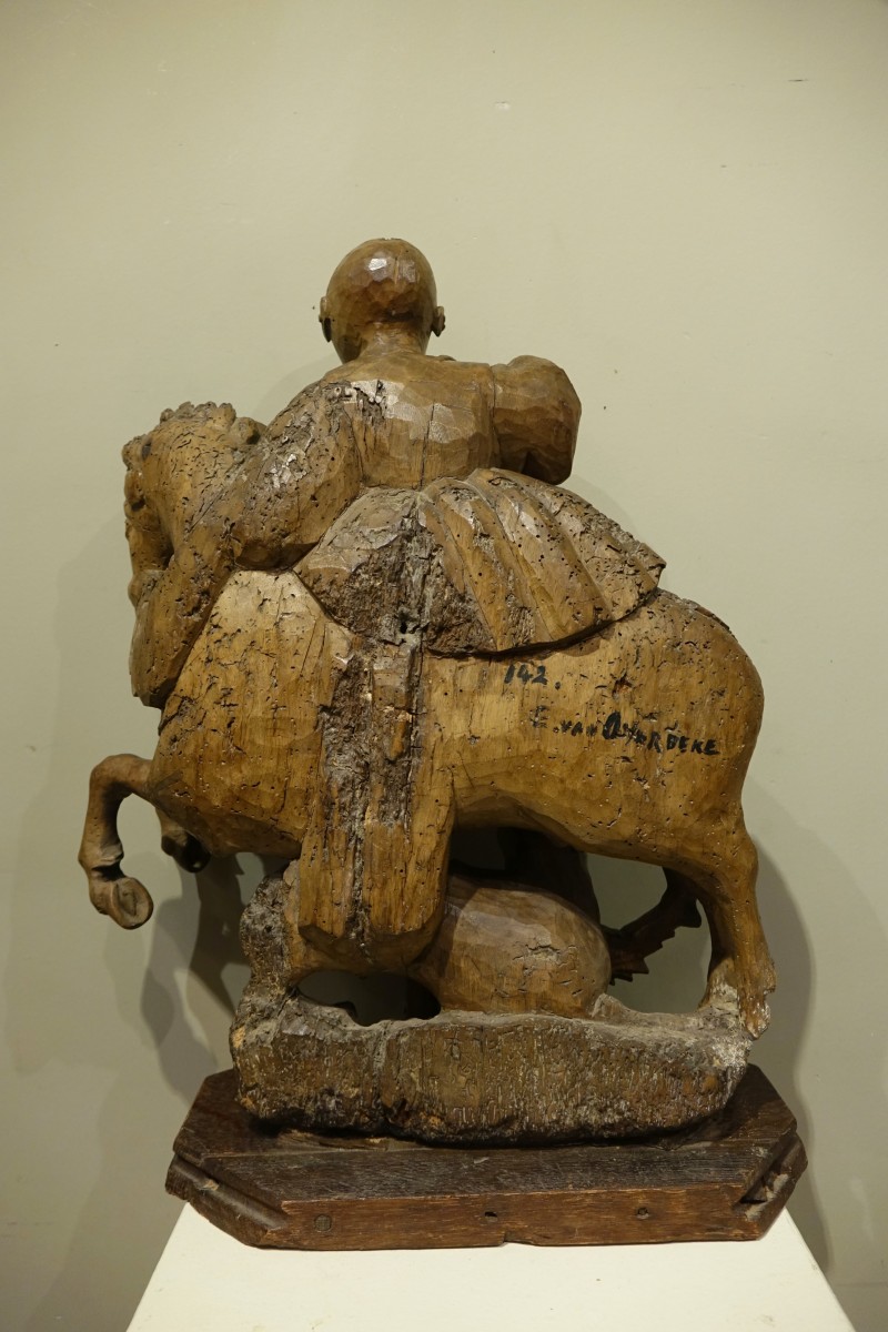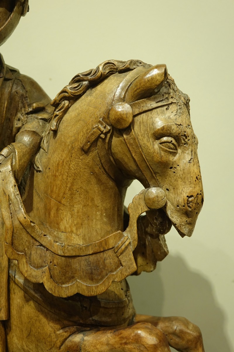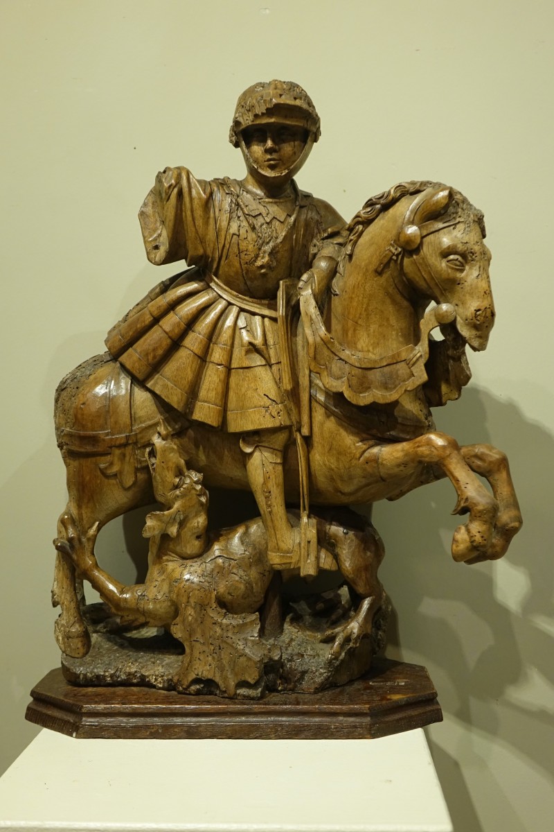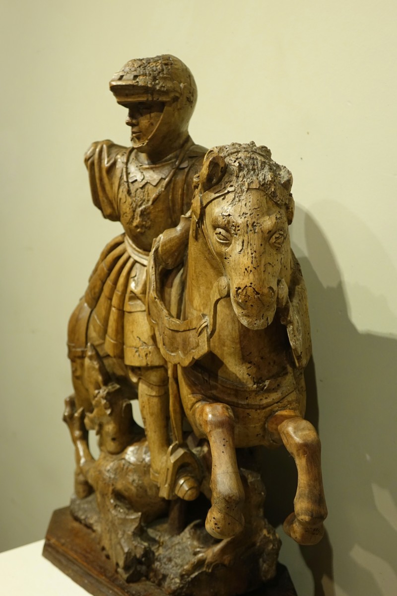 Sculpture en ronde-bosse, représentant Saint Georges terrassant le dragon. Georges de Lydda, né en 280 à Mazaca en Cappadoce , est un martyr chrétien connu pour avoir térrassé le dragon d'après "La légende dorée " de Jacques de Voragine. Canonisé en 494, il est le Patron de la chevallerie chrétienne, du royaume de Grande-Bretagne depuis l'an 800, de la Géorgie, et des armuriers. Il fait figure d'allégorie de la victoire de la Foi chrétienne sur le démon, ou plus largement du bien sur le mal. Manques, usures , mais très belle qualité de sculpture. Le dos est ébauché. Revêtu d'une armure et d'une tunique ceinturée , la tête protégée d'un casque muni d'une mentonnière, le saint militaire est monté sur un cheval cabré sautant par-dessus le monstre pas du tout terrifiant . France, Val de Loire, vers 1520-1530.
