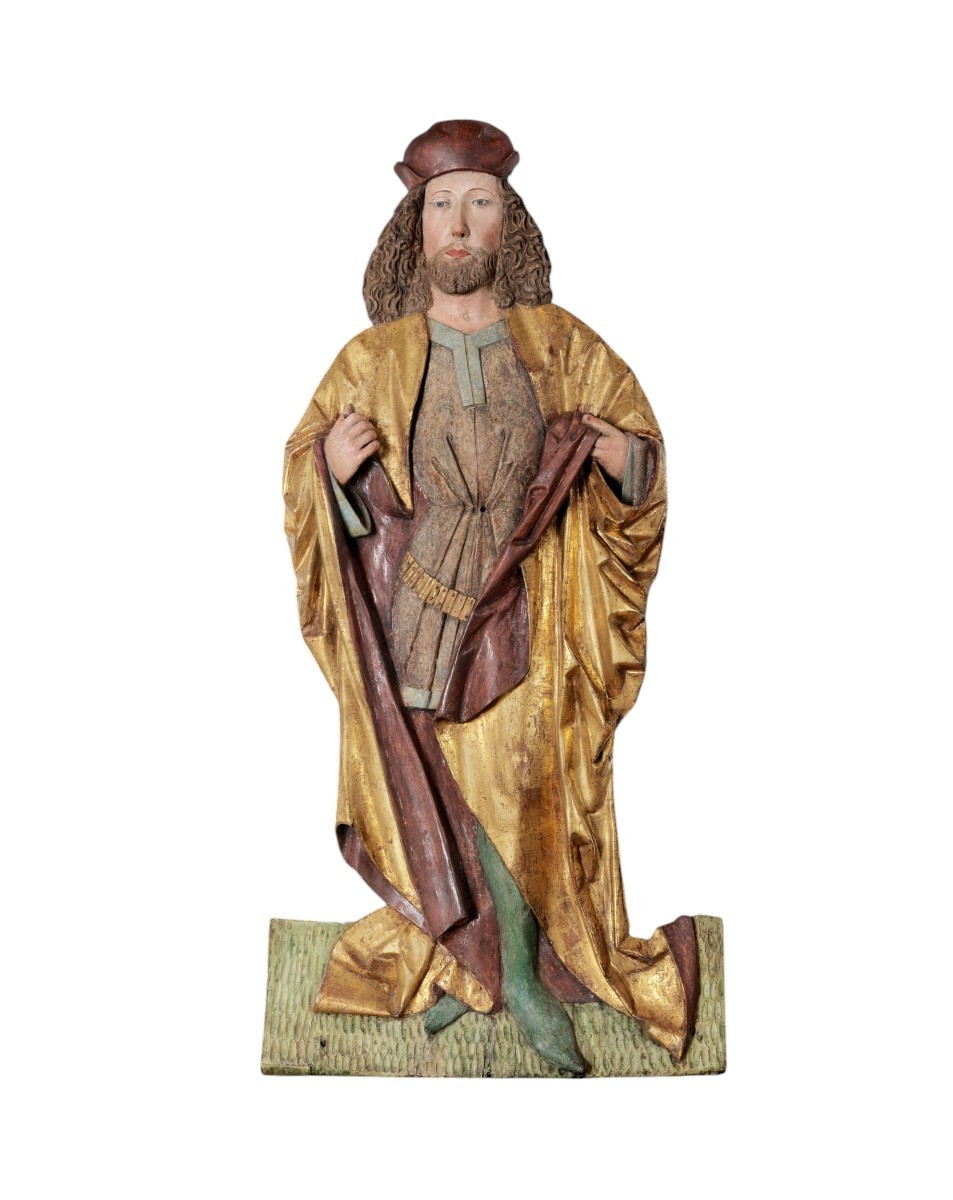 La figure d’un saint homme représentée ici se présente sous la forme d’un bas-relief extrêmement finement sculpté et provient précisément de cet atelier de Bressanone. Le saint se tient de face sur une surface herbeuse finement travaillée. Il est vêtu d’une longue tunique oxydée argentée qui ressemble à une armure grâce à sa ceinture en forme d’armure. Ces vêtements aux reflets métalliques forment un contraste saisissant avec la cape dorée, dont l’intérieur est rouge. On remarque également les longues bottes vertes qui se terminent en pointe et créent une silhouette gothique prononcée.