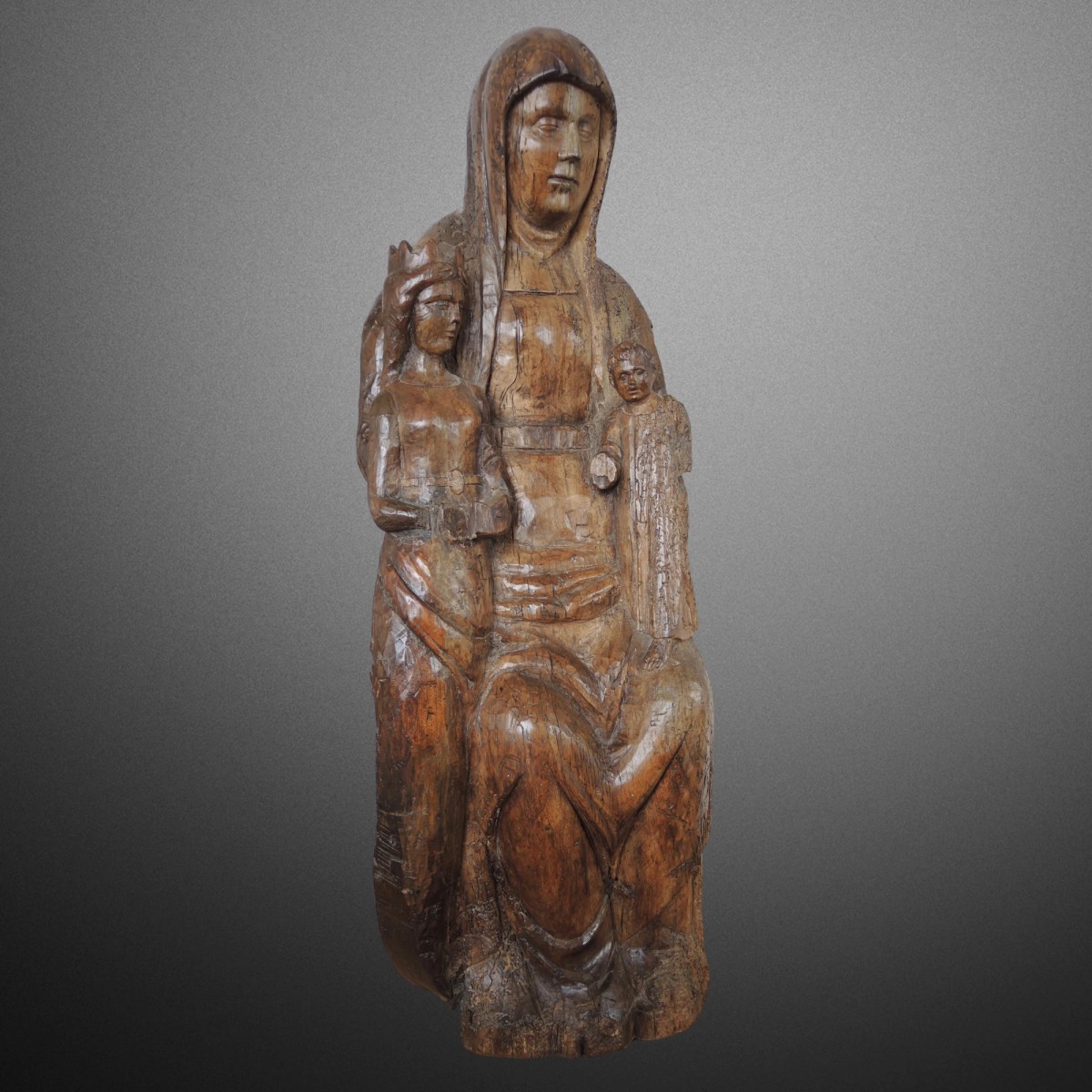 Importante sculpture en bois d’orme en très fort relief évidée au revers. Anne est assise en majesté, voile et guimpe encadrant un visage recueilli, portant à sa gauche l’Enfant bénissant et, à sa droite, la Vierge adolescente couronnée. C’est une iconographie ancienne du thème avec une hiérarchie des tailles typique des prototypes rhénans de la fin du XIIIe siècle. Le choix de l’orme est cohérent avec les pratiques des atelier du Rhin supérieur ou du lac de Constance. Le drapé est traité en plans cassés et cannelures peu profondes, avec des ruptures en V sur les genoux. La ligne demeure plus graphique que naturaliste, signe d’un langage de transition roman–gothique avant l’assouplissement du XIVe siècle.