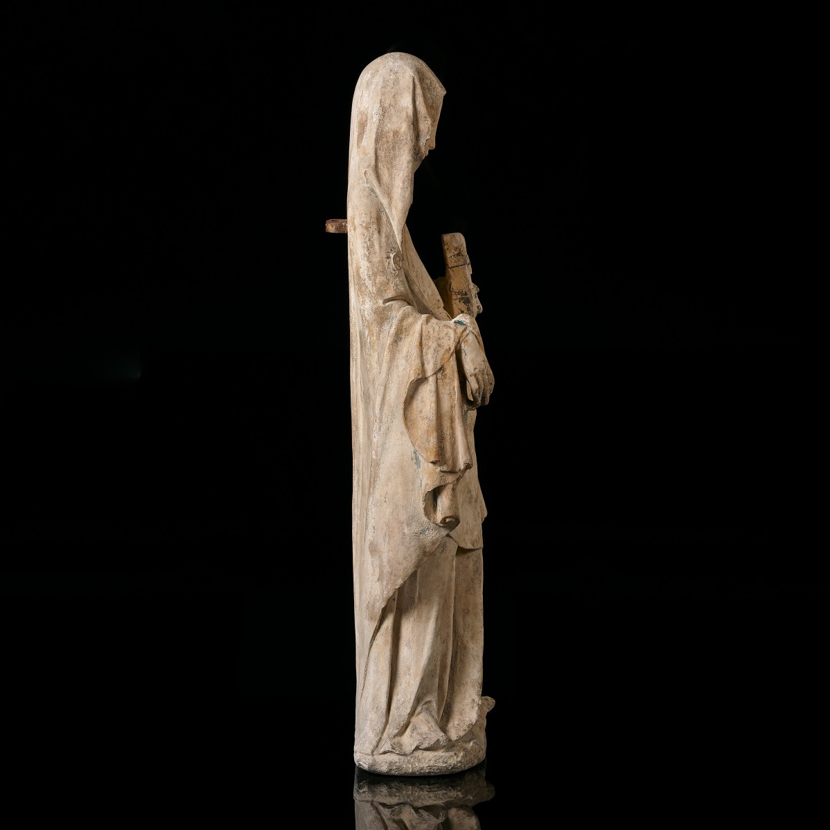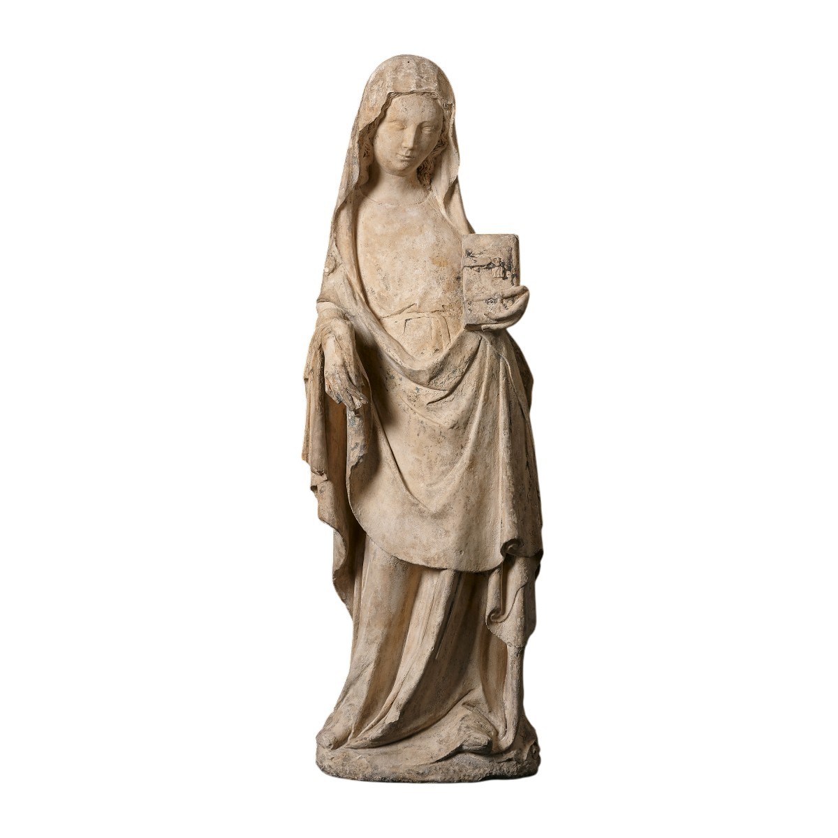 Retrouver le mobilier ou les objets d''art similaires à « Sainte femme tenant un lvre, vers 1325-1350 » présenté par Floris van Wanroij Fine Art, antiquaire à Dommelen dans la catégorie Sculpture en pierre Moyen Âge, Sculpture.