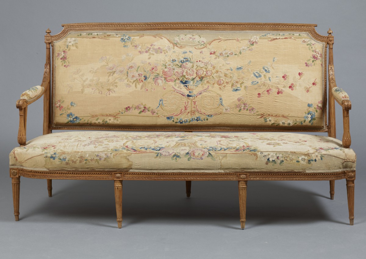 Salon composé d'un canapé et de huit fauteuils en hêtre richement sculpté à dossier à colonnettes et accotoirs à balustre, garniture de tapisserie XVIIIe, époque L.XVI