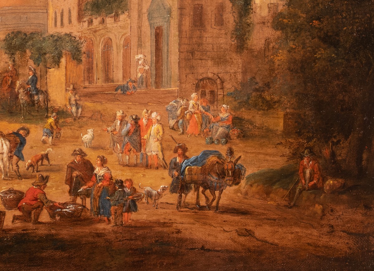 Cette composition vivante illustre une scène de village portuaire baignée de lumière, typique de l'œuvre de Mathys Schoevardts ( 1665 - 1703 ). On y observe une multitude de personnages vaquant à leurs occupations, marchands dechargeant des bateaux, villageois conversant ou se promenant, le tout dans un décor pittoresque mêlant architecture classique, végétation abondante et arrière plan montagneux. Le ciel animé de nuages légers, confère à l'ensemble une atmosphère sereine et lumineuse .