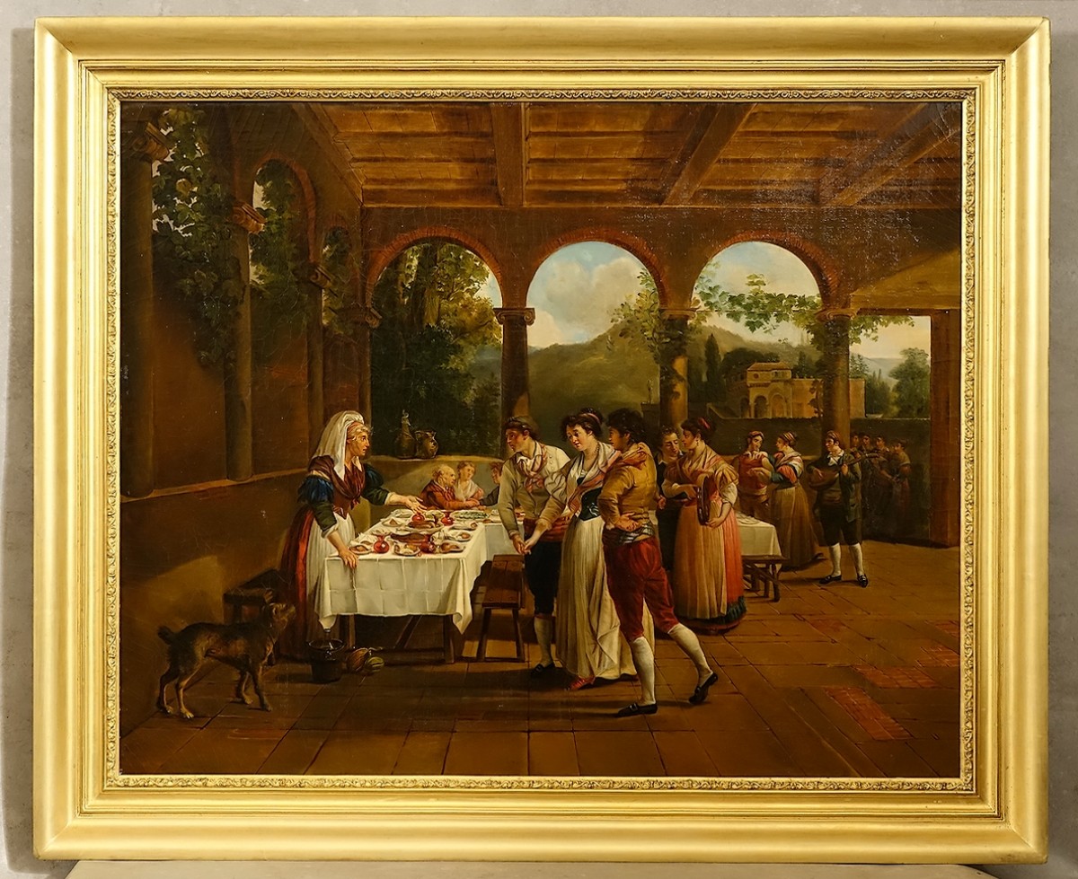 Il s'agit d'une copie ancienne de l'œuvre de Sablet (Jacques Henri Sablet dit « le Peintre du Soleil ». Morges -Suisse- 1749 - Paris 1803) représentant un banquet de fiançailles à Naples.