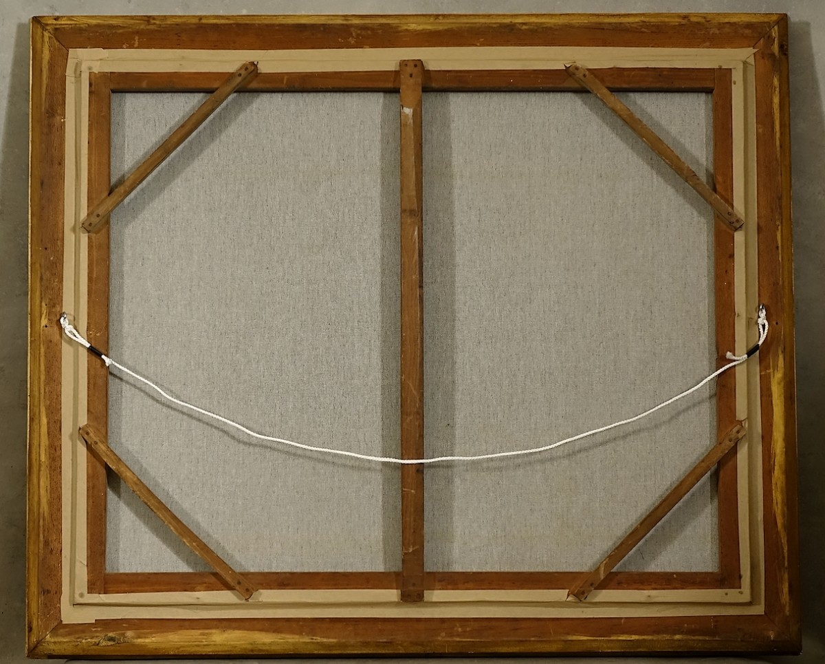Œuvre et cadre en excellent état. Tableau rentoilé (suite à une ancienne déchirure de la toile). Cadre en bois doré en parfait état de conservation.