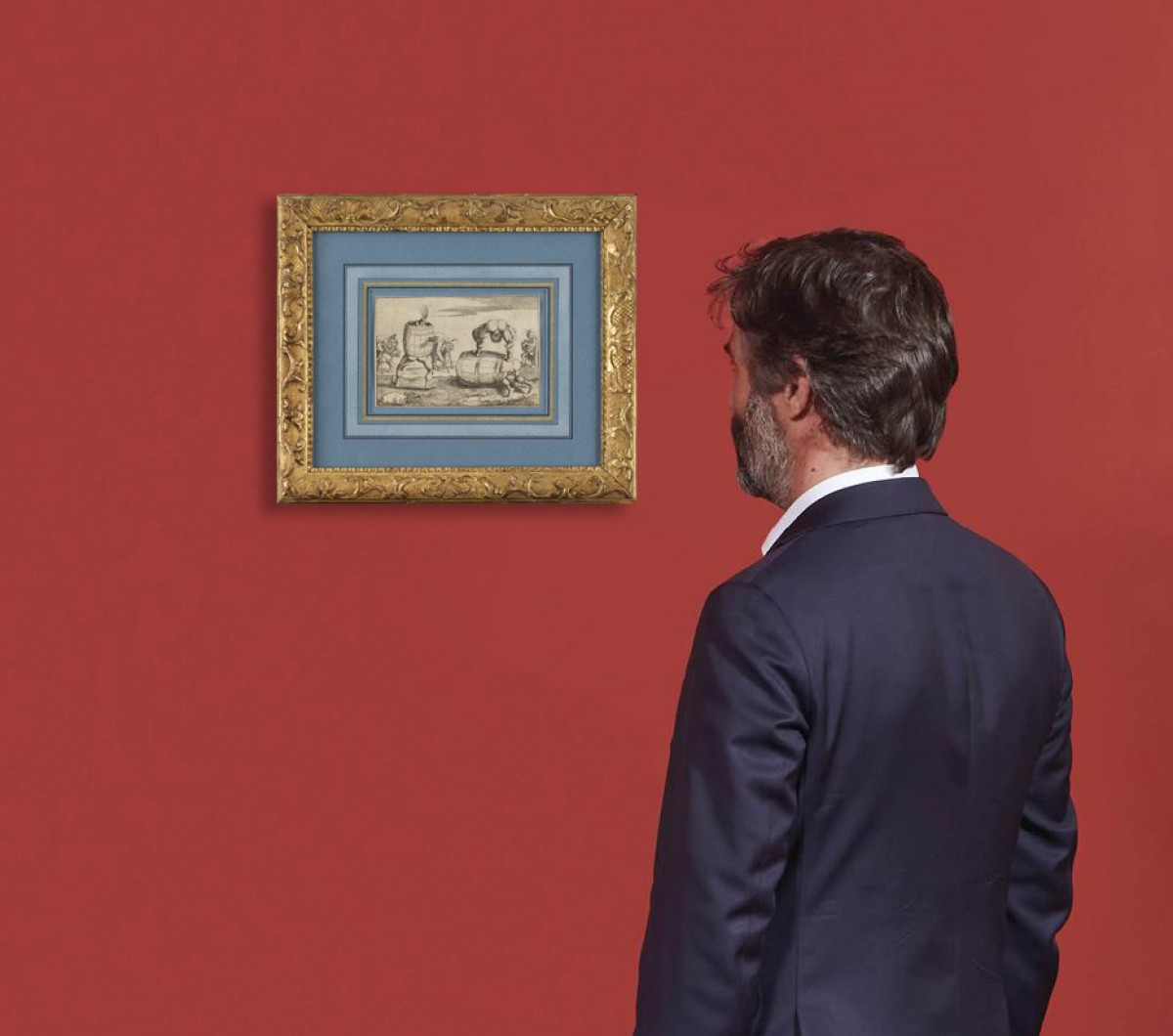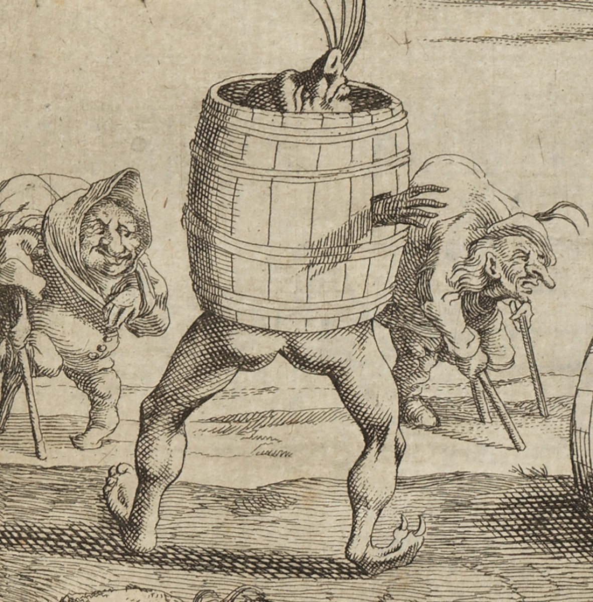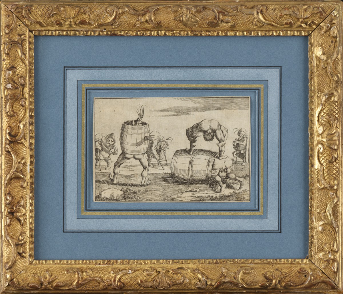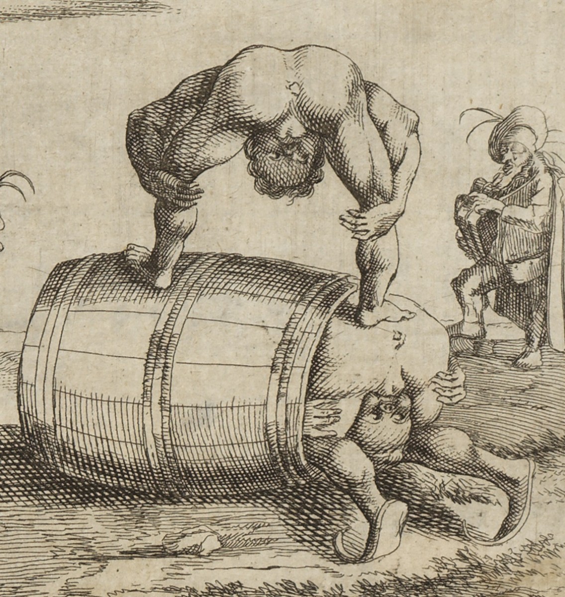 Dans cette frise où le monde semble vaciller sur ses propres appuis, les corps se heurtent, se renversent et s’exposent avec une liberté presque insolente. À droite, deux figures emmêlées composent une scène dont la charge grivoise ne cherche guère à se dissimuler : l’une, basculée en arrière sur le tonneau, offre une posture si ouverte qu’elle frôle la provocation, tandis que l’autre, à demi enfouie dans l’ouverture du fût, ajoute à l’ensemble une tension corporelle qui confine au geste pornographique, mais traité avec cette distance ironique propre au burlesque ancien. Rien n’est montré, tout est suggéré, et c’est précisément dans cette zone trouble que Mitelli excelle : un théâtre populaire où le désir, la maladresse et le ridicule se confondent.