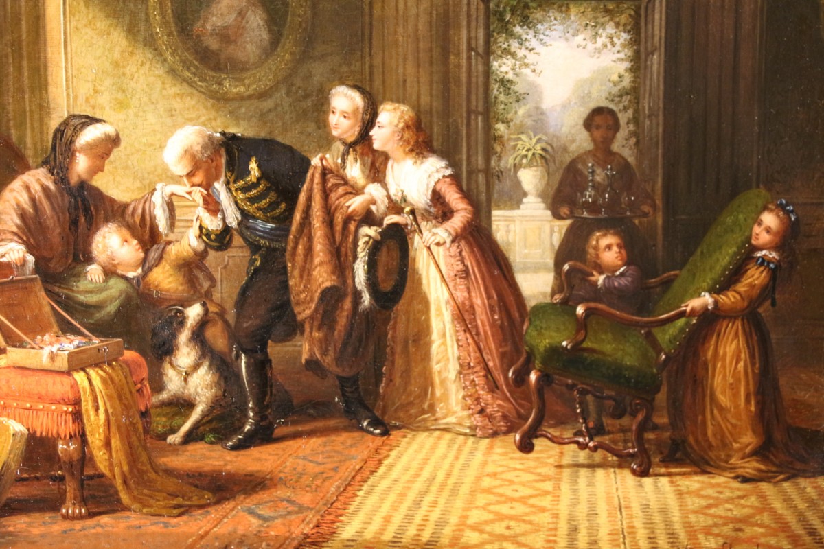 Huile sur toile représentant une scène de genre " Les présentations", signée ANSI SHEARBON et datée de 1868, appartenant à l'école anglaise du XIXe siècle.