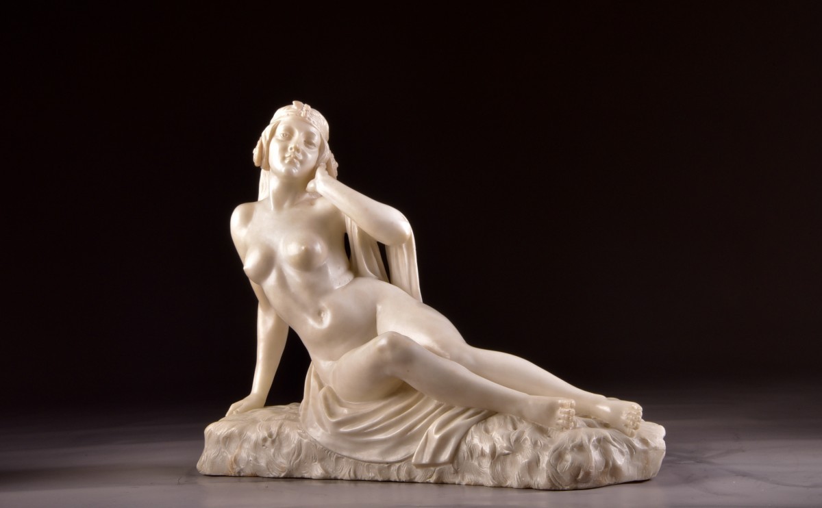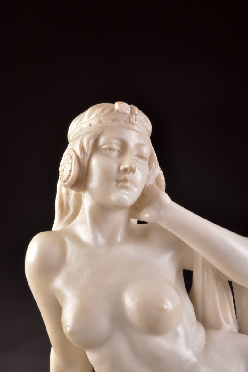 Retrouver le mobilier ou les objets d''art similaires à « Sculpture en d'albâtre par Alberto Currini, ca. 1900 » présenté par Mora Antiques, antiquaire à Bilzen dans la catégorie Sculpture en Marbre Art nouveau, Sculpture.