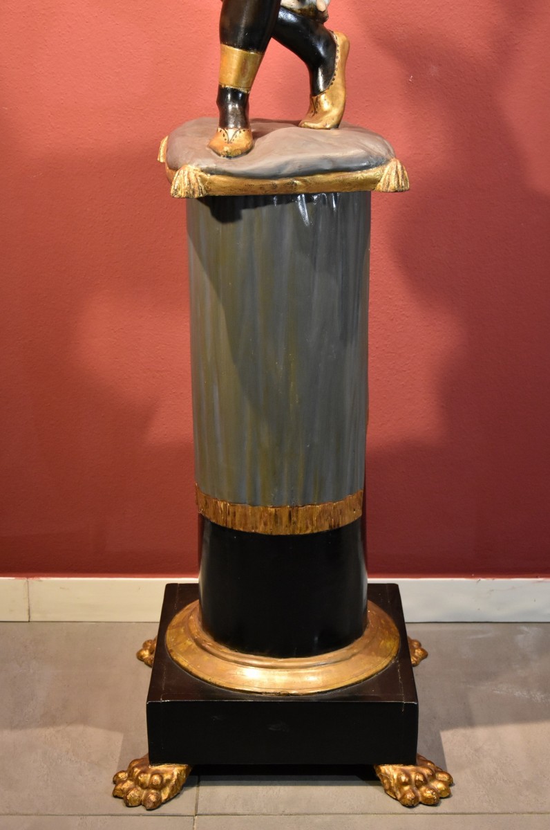 Il s'agit d'une sculpture qualitative en bois représentant un Maure avec un sujet féminin, emblème de la tradition sculpturale vénitienne, représenté en position debout et tenant dans ses mains une corne d'abondance fleurie. La figure est placée sur une base en forme de colonne cylindrique drapée, également en bois, soutenue par quatre pieds en fer.