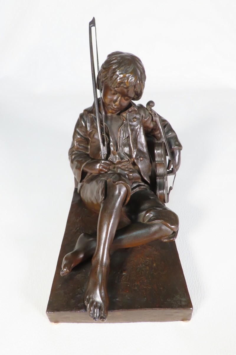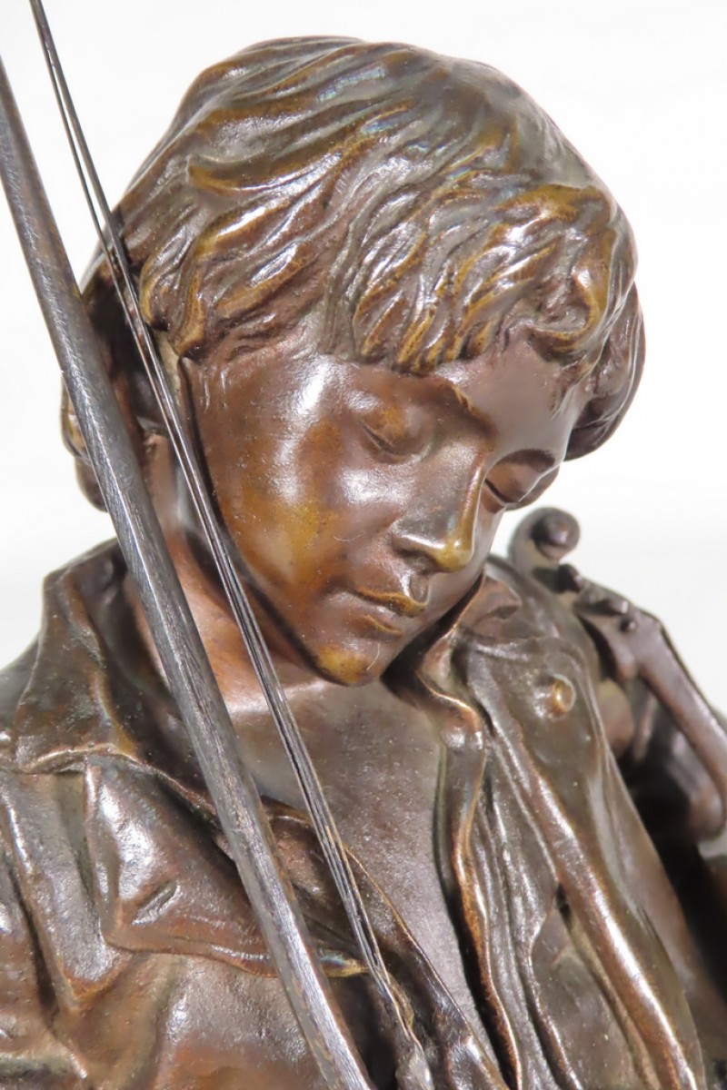 Bronze à patine brune représentant un jeune Violoniste endormi avec son archet amovible dans sa main droite et son violon sur sa gauche. Ce bronze porte la signature Tharet sur la base ainsi que la signature du fondeur sur l’arrière Susse Frères. Belle patine. Bronze d’époque fin XIX ème SIècle.