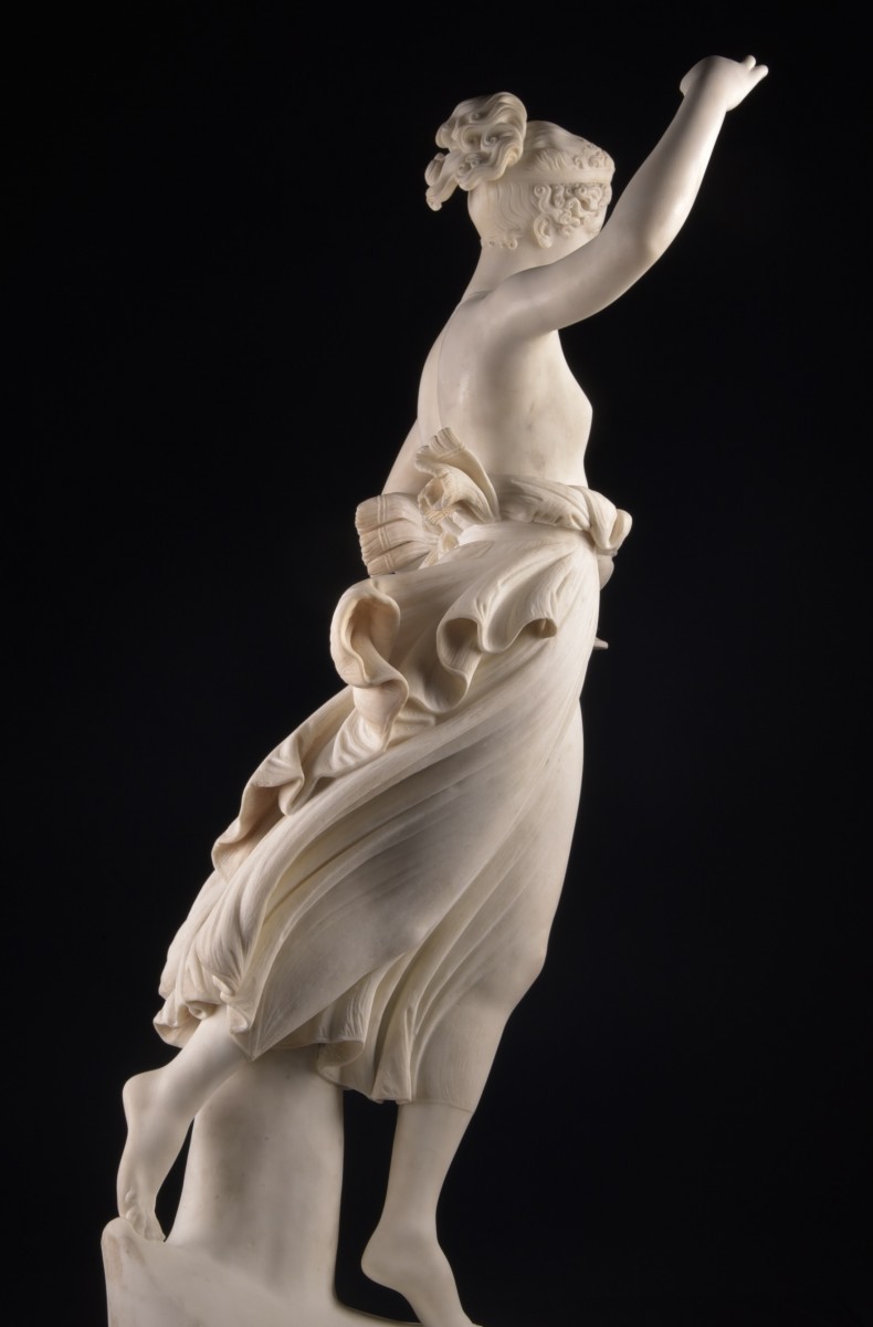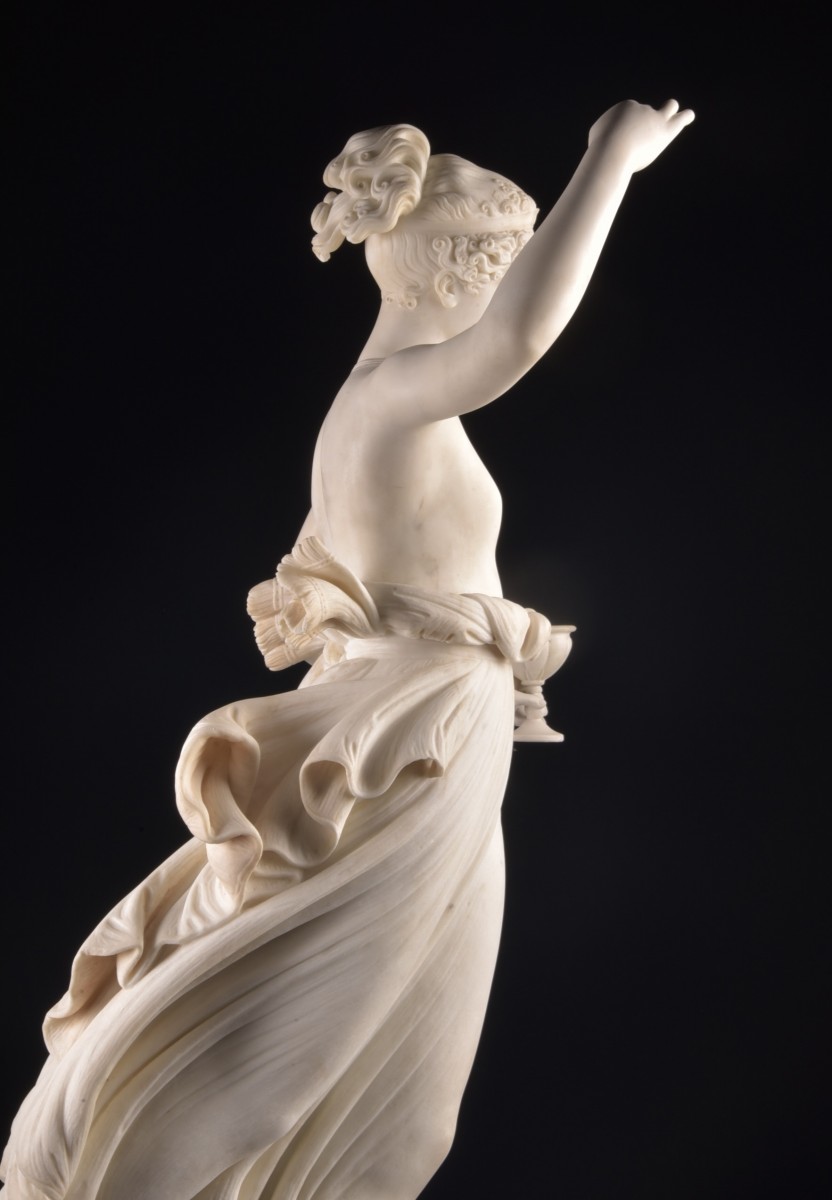 Cette élégante sculpture en marbre figure Hébé, déesse grecque de la jeunesse et échansonne des dieux sur le mont Olympe. Par son attitude gracieuse et le raffinement de son mouvement, elle incarne pleinement l’idéal de beauté classique recherché à l’époque néoclassique. Le modèle s’inspire directement de la célèbre composition d’Antonio Canova (1757–1822), qui réalisa quatre versions de cette œuvre entre 1796 et 1817. La première, exécutée entre 1796 et 1799, est aujourd’hui conservée à la Neue Pinakothek de Munich. Cette figure est considérée comme l’un des exemples majeurs de la sculpture néoclassique, remarquable par la pureté de ses lignes et l’harmonie de ses proportions. Une pièce décorative de grande présence, idéale pour un intérieur classique ou un cadre prestigieux. Dimensions :