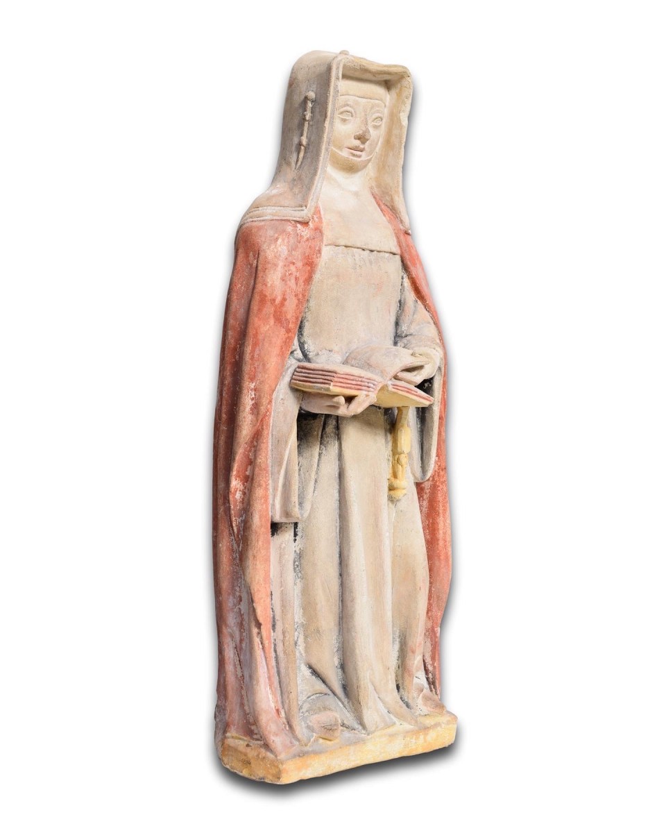 La sainte tient un livre ouvert dans sa main droite et tourne plusieurs pages avec sa gauche, son visage a des traits juvéniles et des yeux en amande. Sa tête est encadrée par une guimpe fixée par des épingles apparentes sur le dessus et les côtés. Elle porte un manteau couvrant l'habit d'une nonne, sa robe fixée par une fine ceinture qui pend à sa taille.
