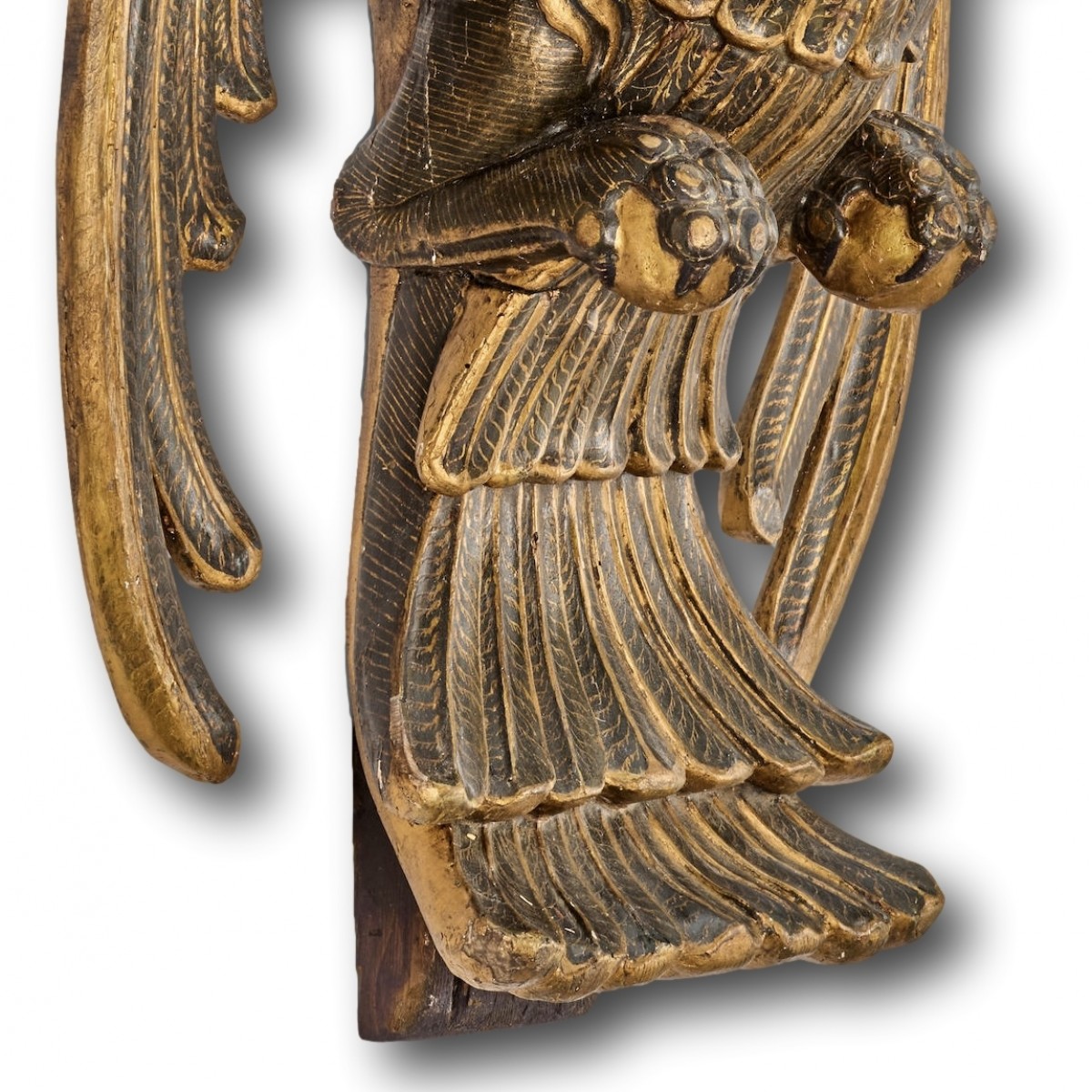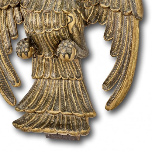 Sculpture puissante et expressive d'un aigle couronné, les ailes déployées de façon spectaculaire, exprimant majesté et autorité. Réalisée en bois, elle conserve des traces de décoration polychrome et dorée d'origine. Une couronne repose sur la tête de l'aigle, tandis que ses serres saisissent deux sphères, probablement emblématiques de la souveraineté ou de la domination céleste. Un superbe exemple de l'artisanat baroque tardif d'Europe du Nord.