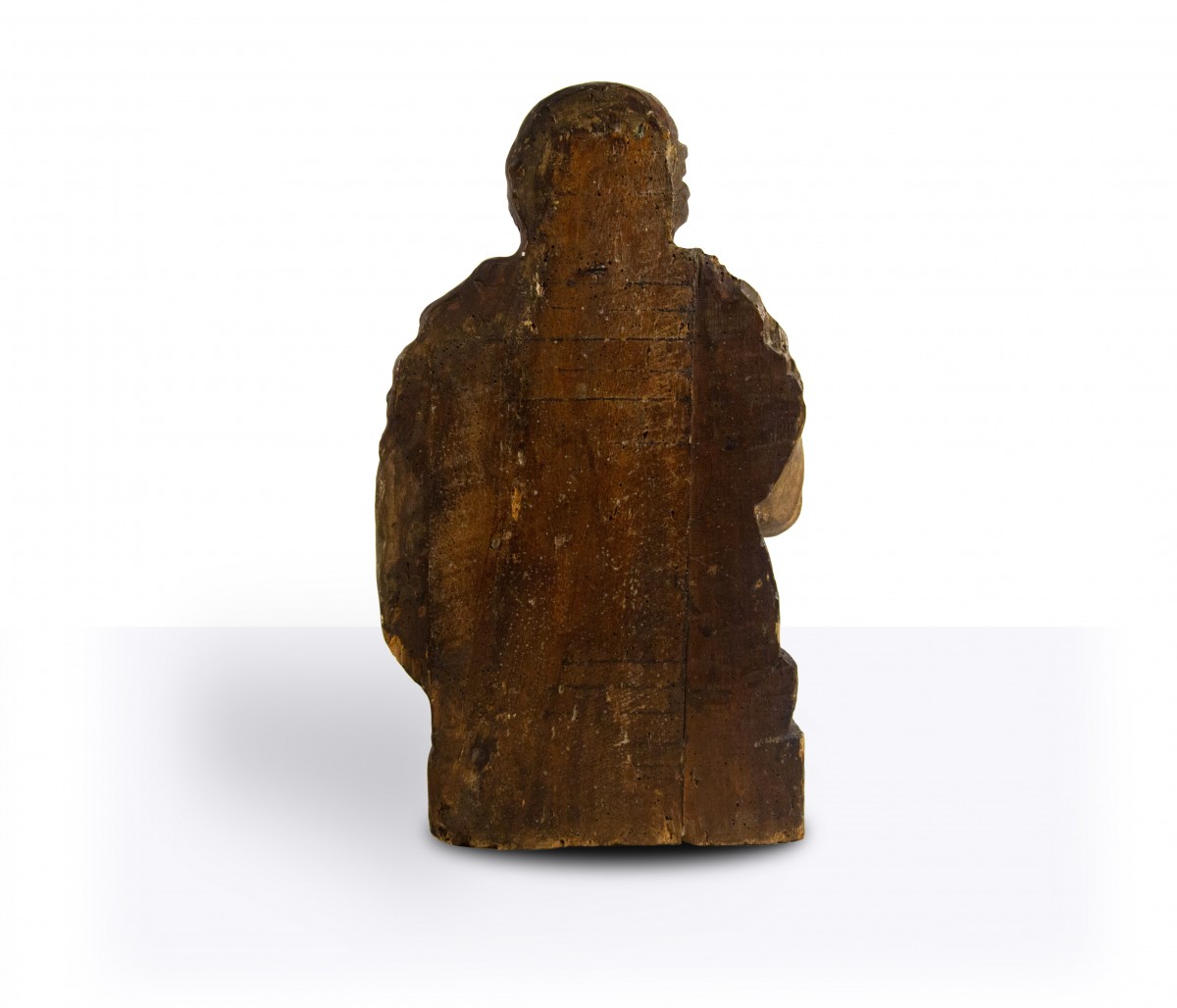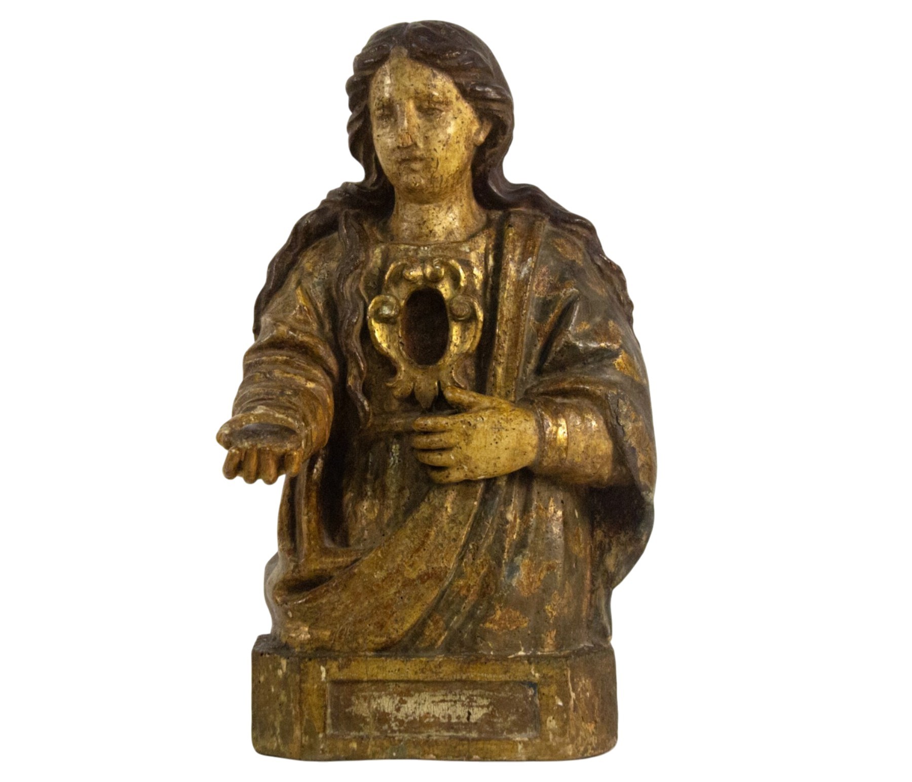 Sculpture-reliquaire en bois sculpté, laqué et doré, du XVIIe siècle, inspirée du buste de Marie-Madeleine, présentant un petit compartiment à profil en volute au centre du coffre. Reposant sur un socle lisse ; 62 x 36 x 28 cm.