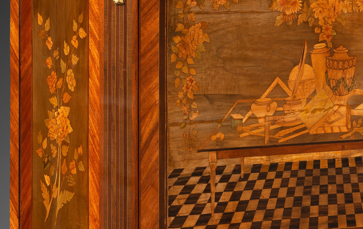 En façade, il ouvre par un abattant orné d’une marqueterie complexe : Sur un parquet en damier, une table présente des objets sur le thème des Arts Libéraux et des arts majeurs, couronnés par une belle guirlande de fleurs. En partie basse, le meuble s’ouvre à deux vantaux, chacun orné de vases couverts. Les pans coupés simulent des pilastres cannelés. Enfin, le tiroir supérieur est orné d’une frise.