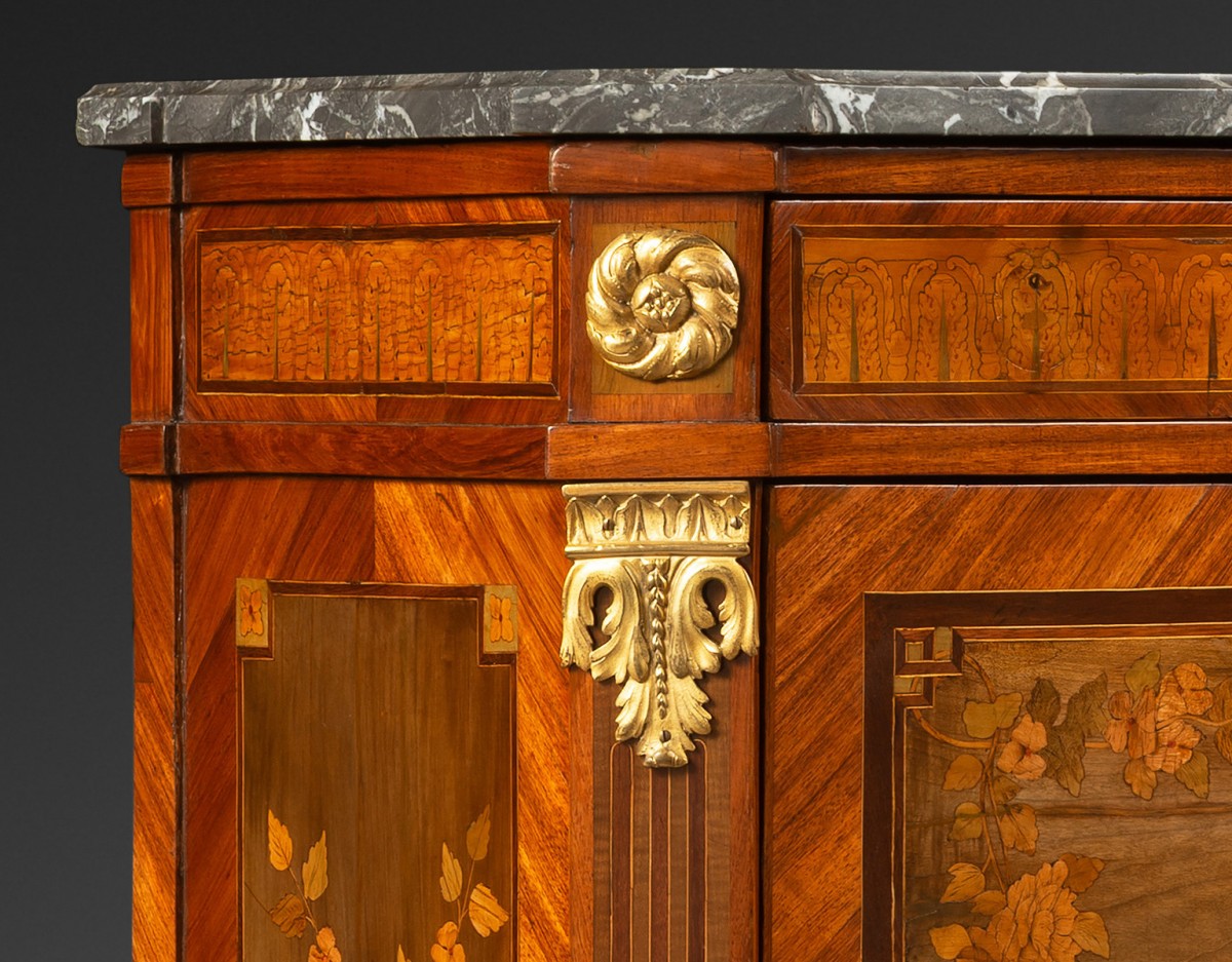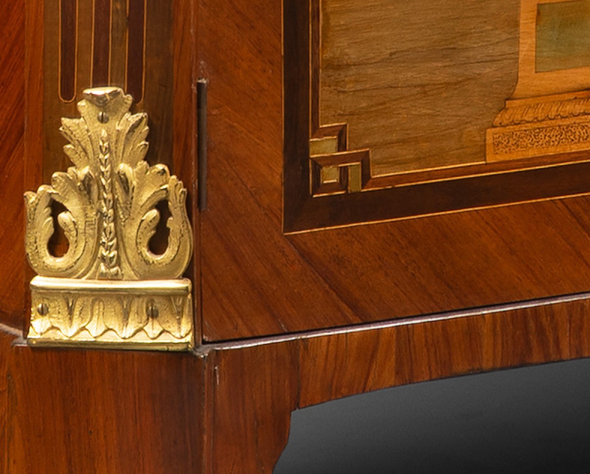 Sur les côtés, on retrouve une marqueterie de branches et de fleurs, d’égale qualité, et répartie en trois panneaux qui reprennent l’étagement des portes, de l’abatant et du tiroir de ...