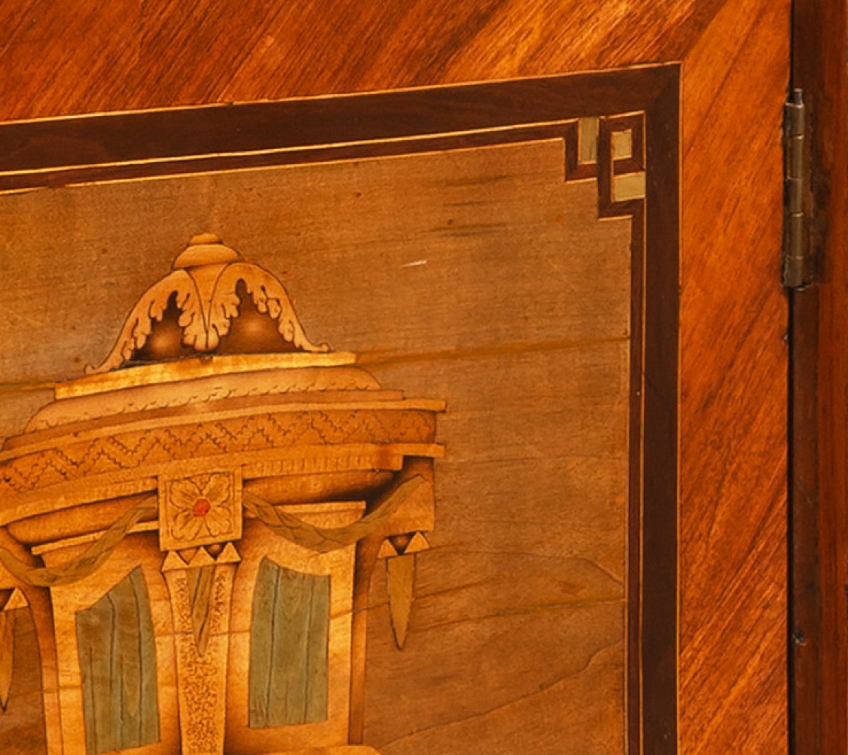 Les 10 panneaux de marqueterie sont réalisés dans des encadrements dont les coins présentent un décor à la grecque. Le riche décor été réalisé avec une très grande variété d’essences de bois : sycomore, divers bois fruitiers teintés, filets de buis, palissandre, bois de rose et amarante.
