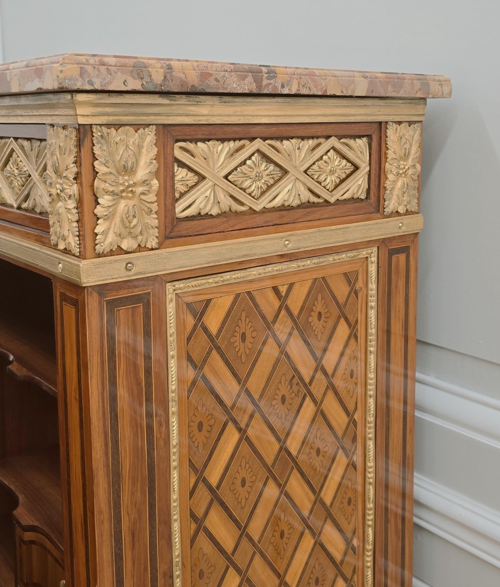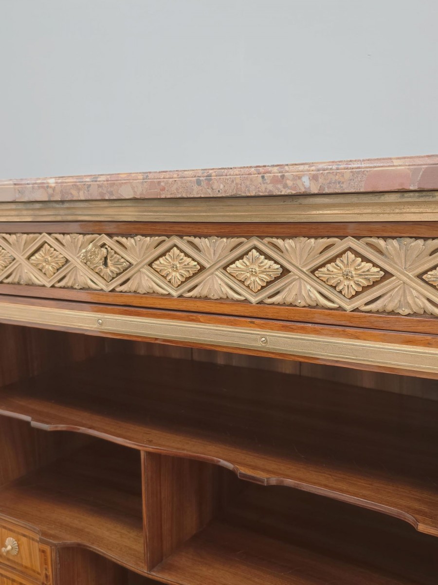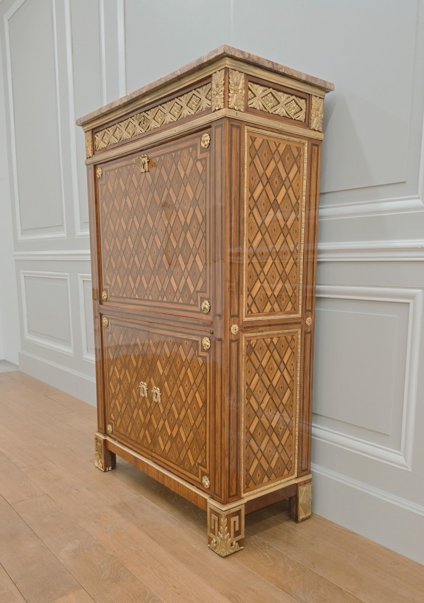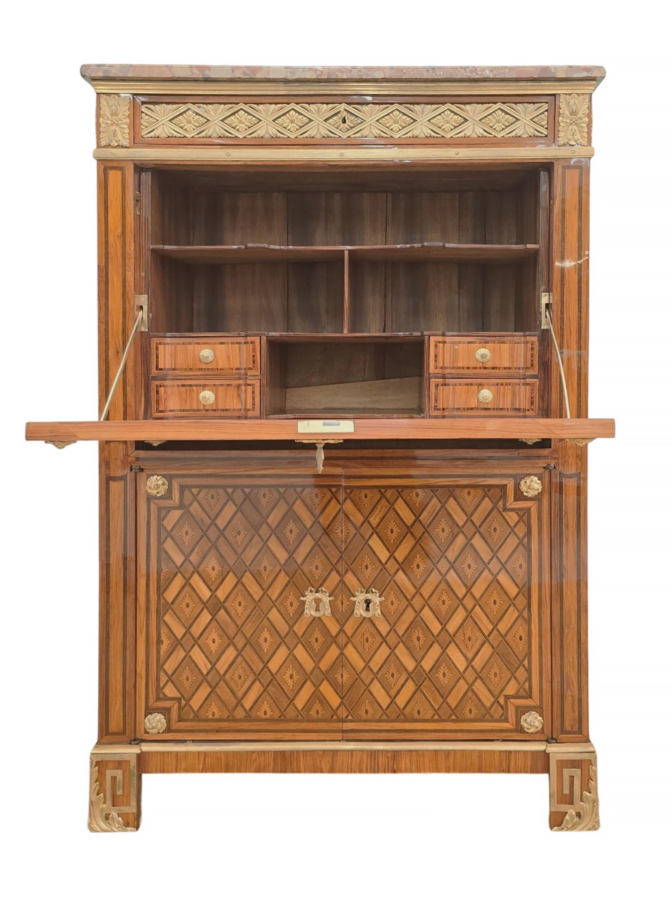 Secrétaire à abattant en marqueterie à la reine d'époque Louis XVI estampillé Marchand et JME ouvrant à un tiroir en ceinture surmontant un abattant découvrant quatre petits tiroirs, dans le bas un coffre et deux compartiments. La façade et les côtés à décore d'une frise et rosaces en bronze en partie supérieure et décorés de panneaux en marqueterie à la reine sur fonds de bois citronnier encadrement bois de rose. Riche garniture et bronze doré . Dorure au mercure d'origine Dessus marbre brèche d'ale