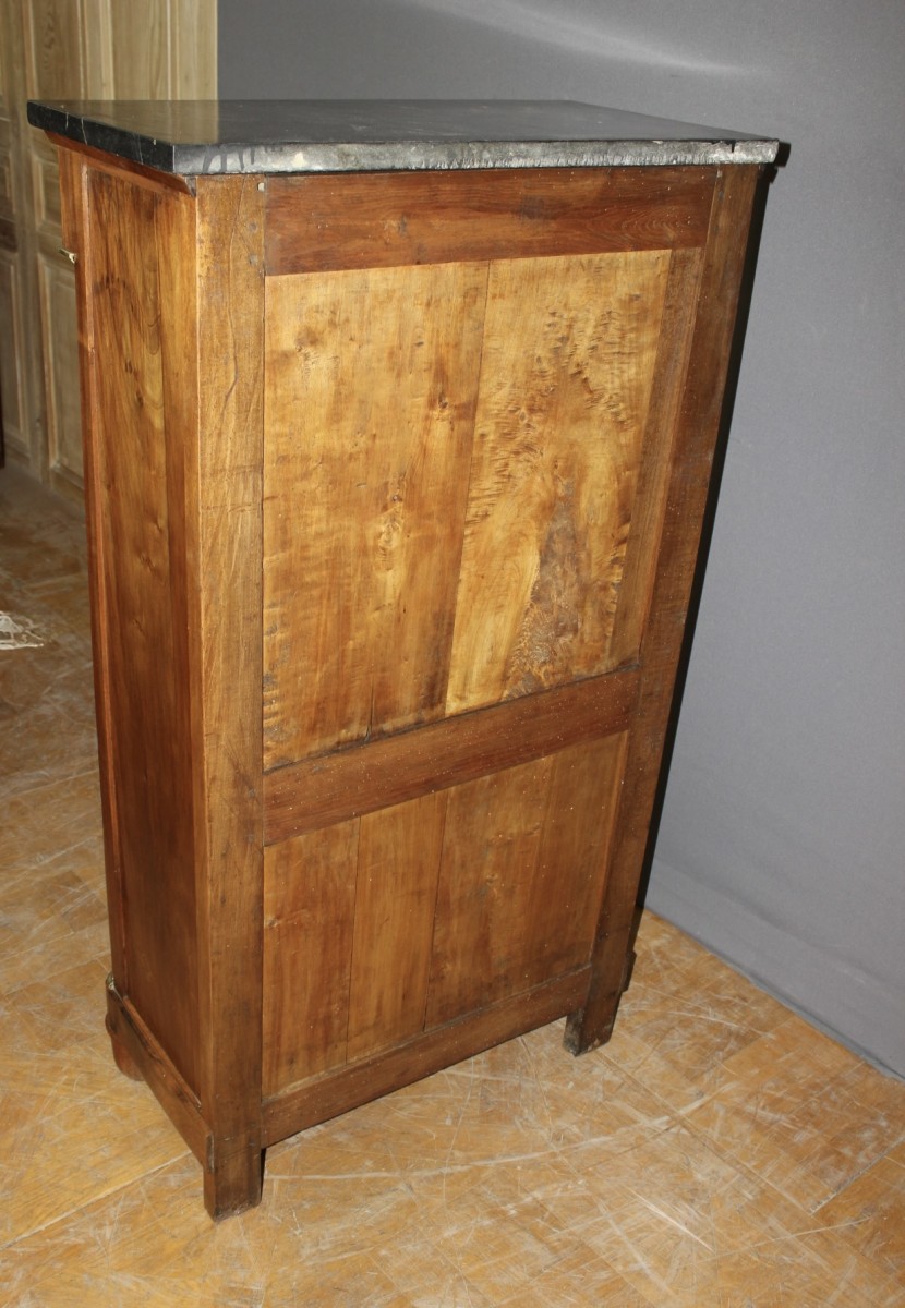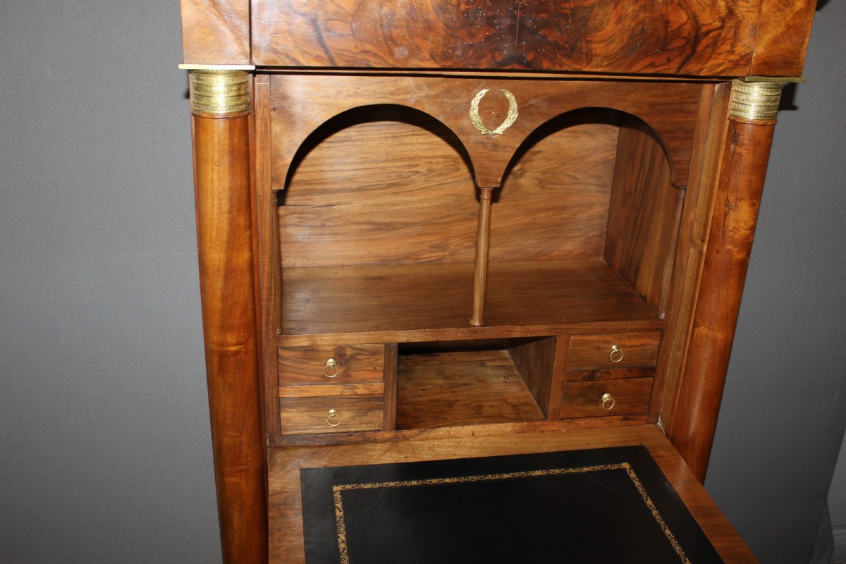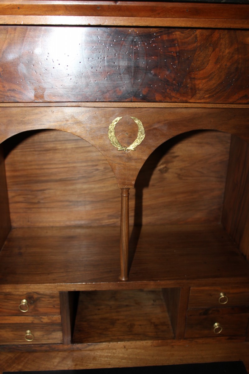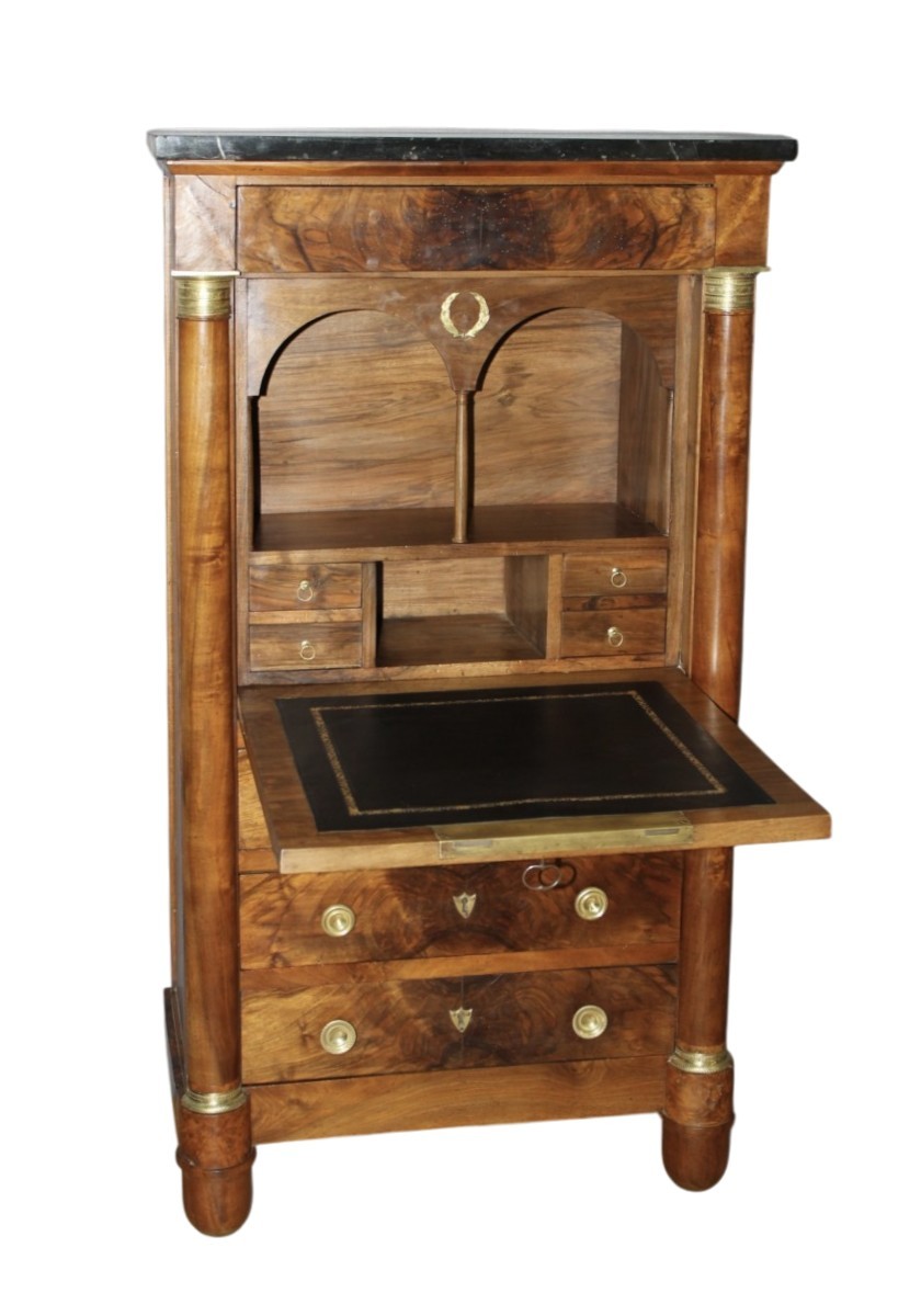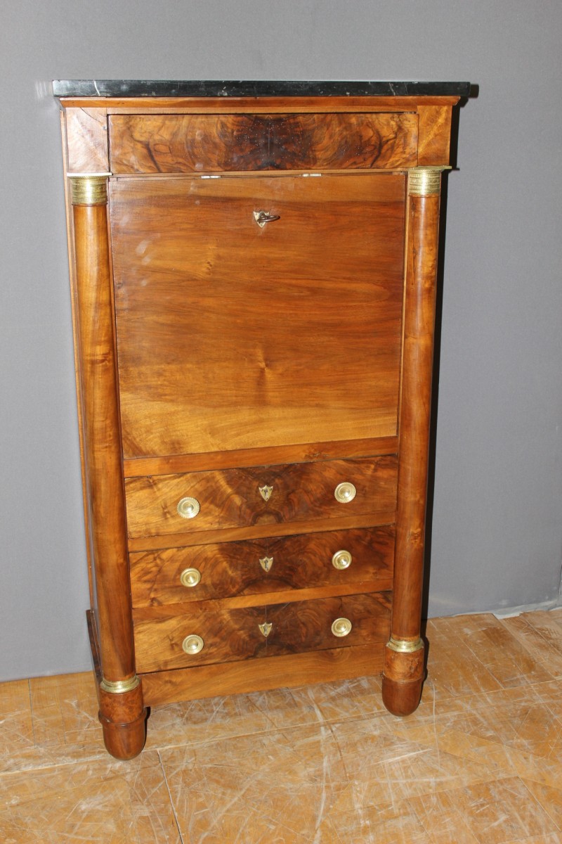 Petit Secrétaire de style Empire à demi colonnes en noyer , il ouvre par un abattant et quatre tiroirs, le théâtre est composé de colonnes et de quatre tiroirs, dessus de marbre noir, finition cirée, époque deuxième moitié du XIXe, ensemble en très bon état