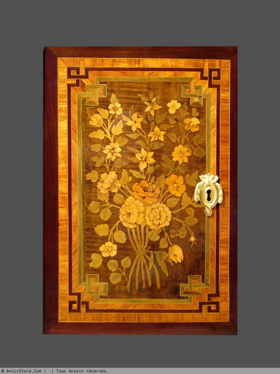Marqueterie de bois de placage exotiques et indigènes naturels ou teintés. Le volet est marqueté d’un panier de fleurs dans un double encadrement de filets à grecques. Les vantaux sont marquetés de bouquets de fleurs également dans un double encadrement de filets à grecques. Le tiroir décoré d’un enrouement dont chaque case inscrit une rosace. Les montants à pans coupés plaqués d’une feinte cannelure. Les côtés également marquetés de bouquets. Dessus de marbre brèche d’Alep à bord mouluré à cavet. Chutes de bronze doré à guirlande. Tablier de bronze doré.