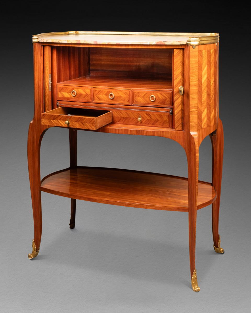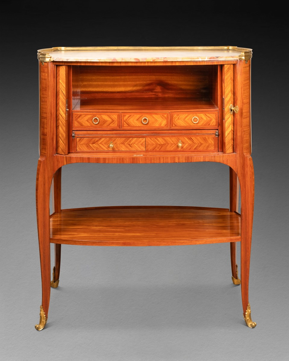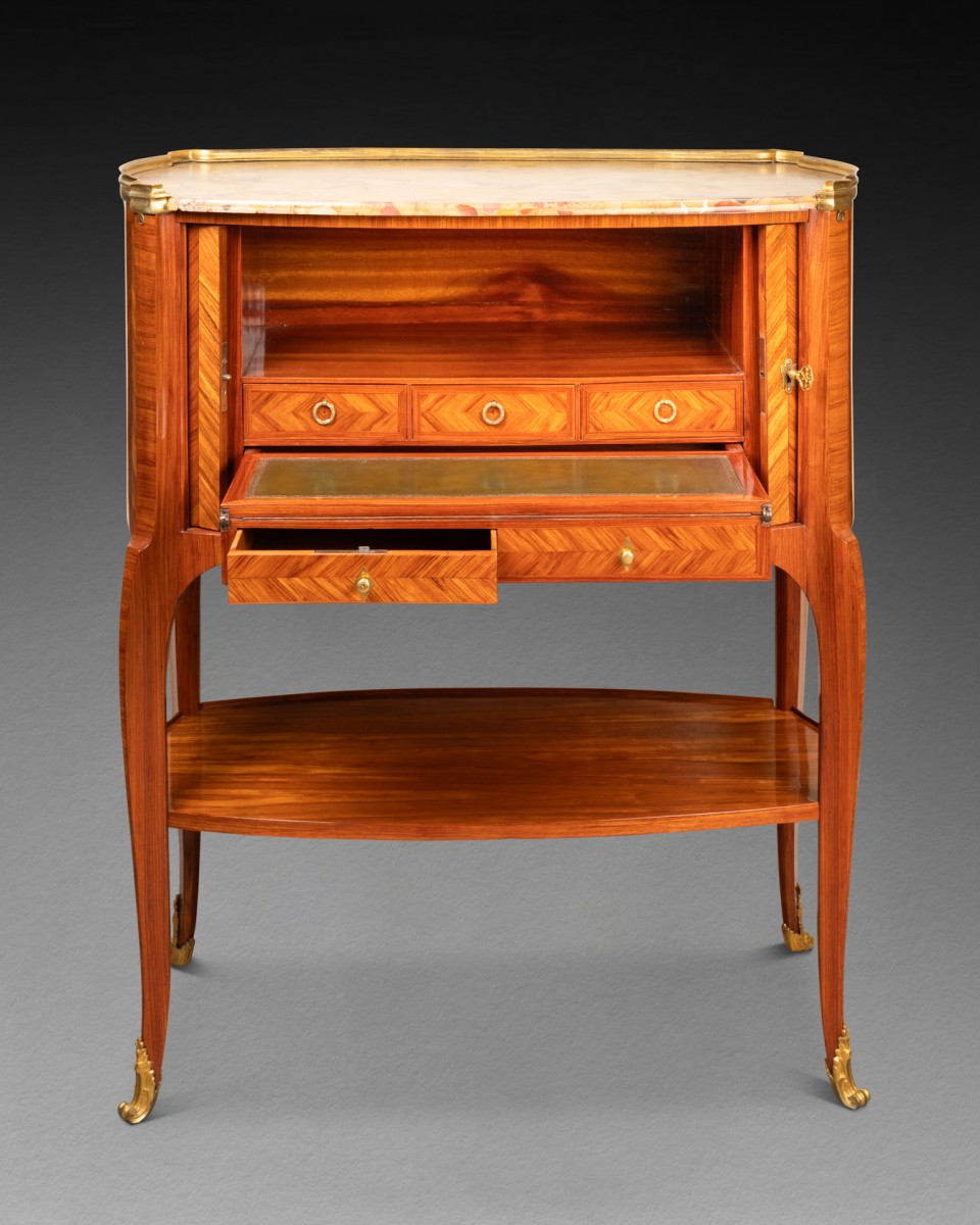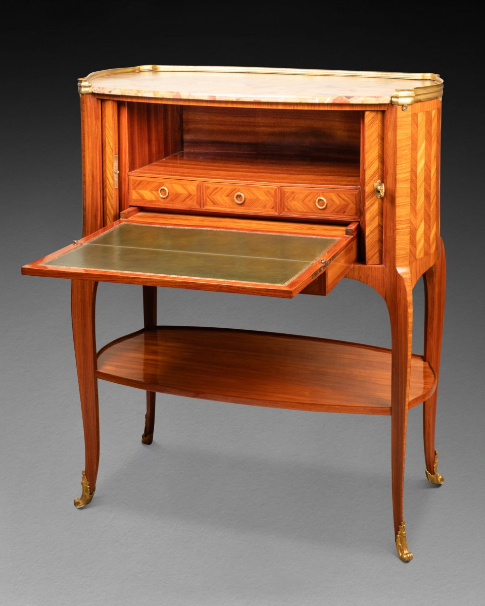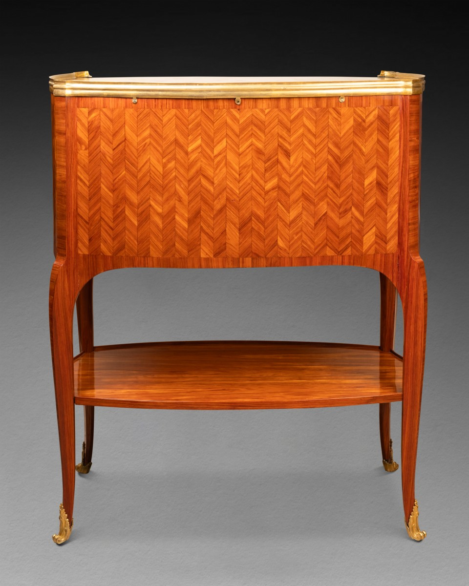 Il s'agit d'un meuble composé, en partie supérieure, d'un tambour oblong plaqué d'une marquèterie de chevrons verticaux de bois de rose, et s'ouvrant en façade par un rideaux de lamelles plaqués de chevrons de bois de rose. Le meuble repose sur quatre pieds cambrés, réunis par une tablette plaquée du même bois de rose. Il découvre en partie inférieure des casiers munis de cinq tiroirs dont deux découvrant une tablette garnie de cuir formant écritoire. Le meuble est coiffé d'un marbre brèche d'Alep ceint d'une galerie de bronze doré.