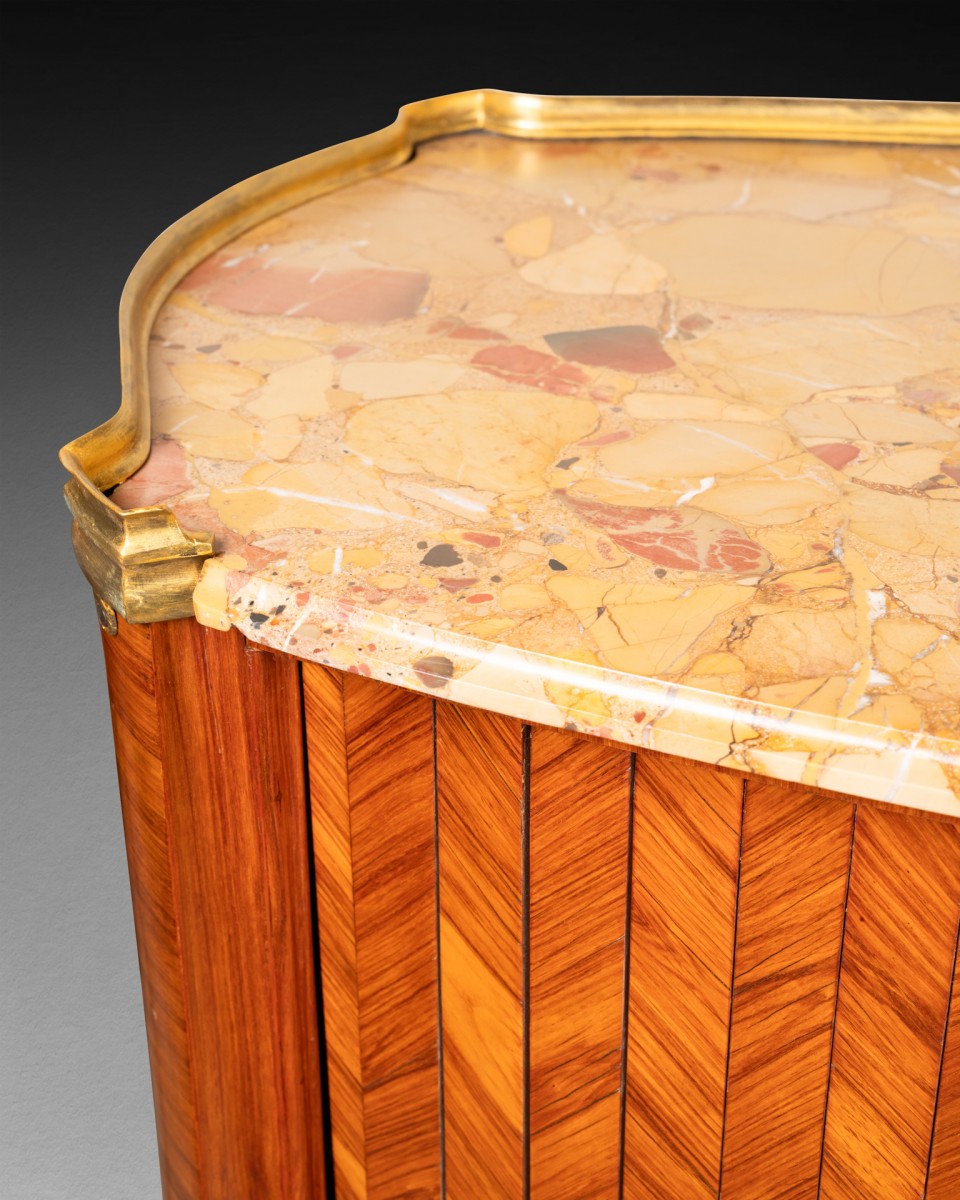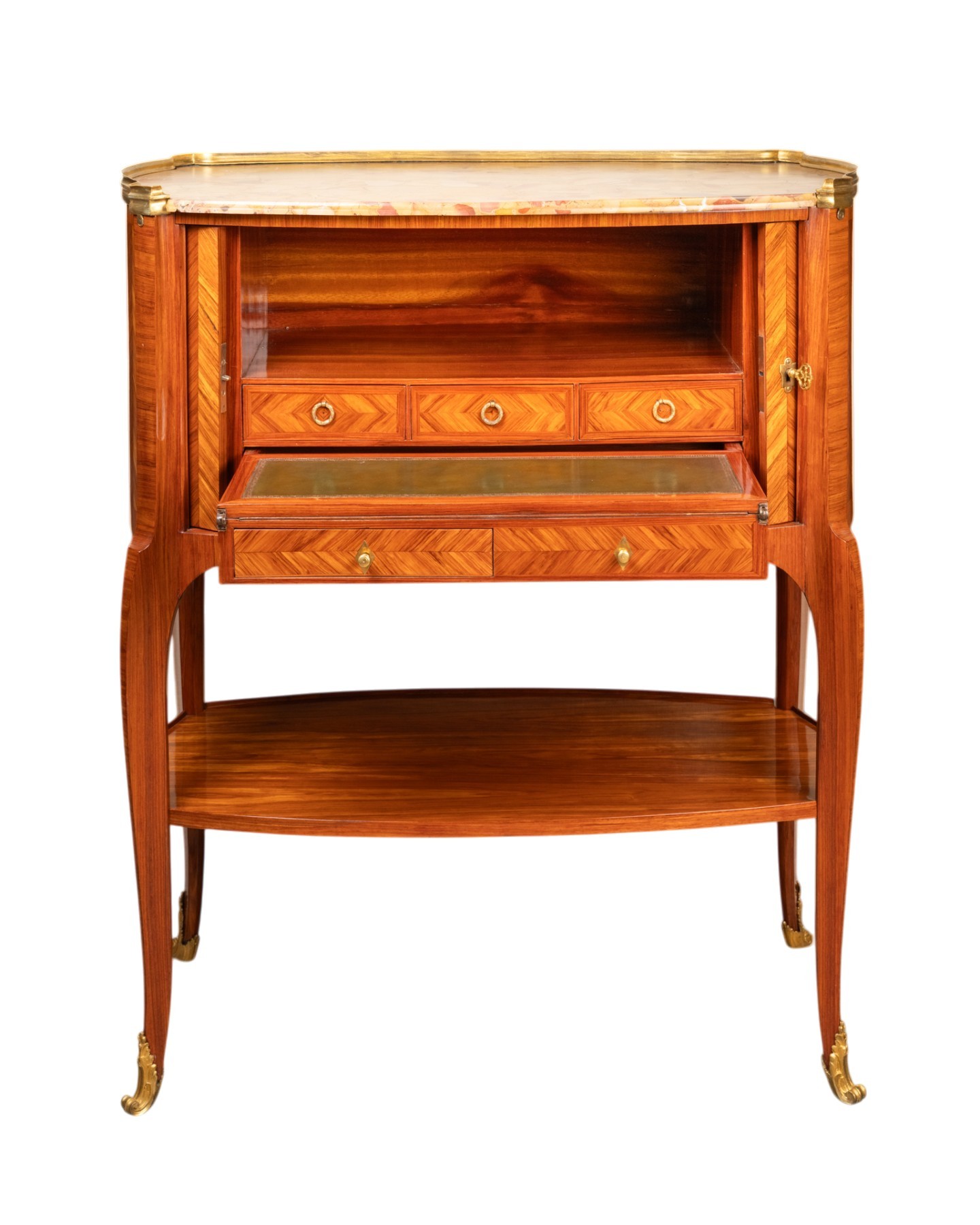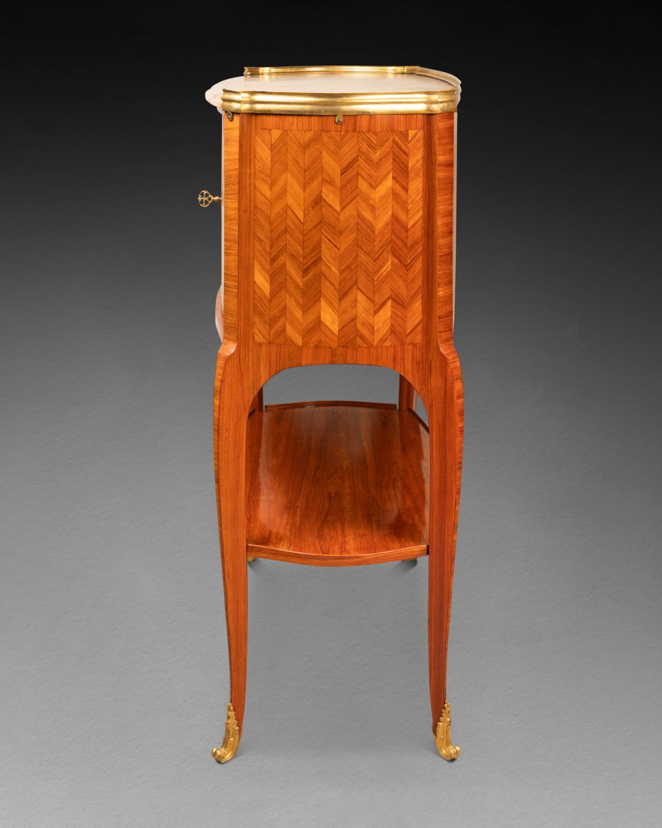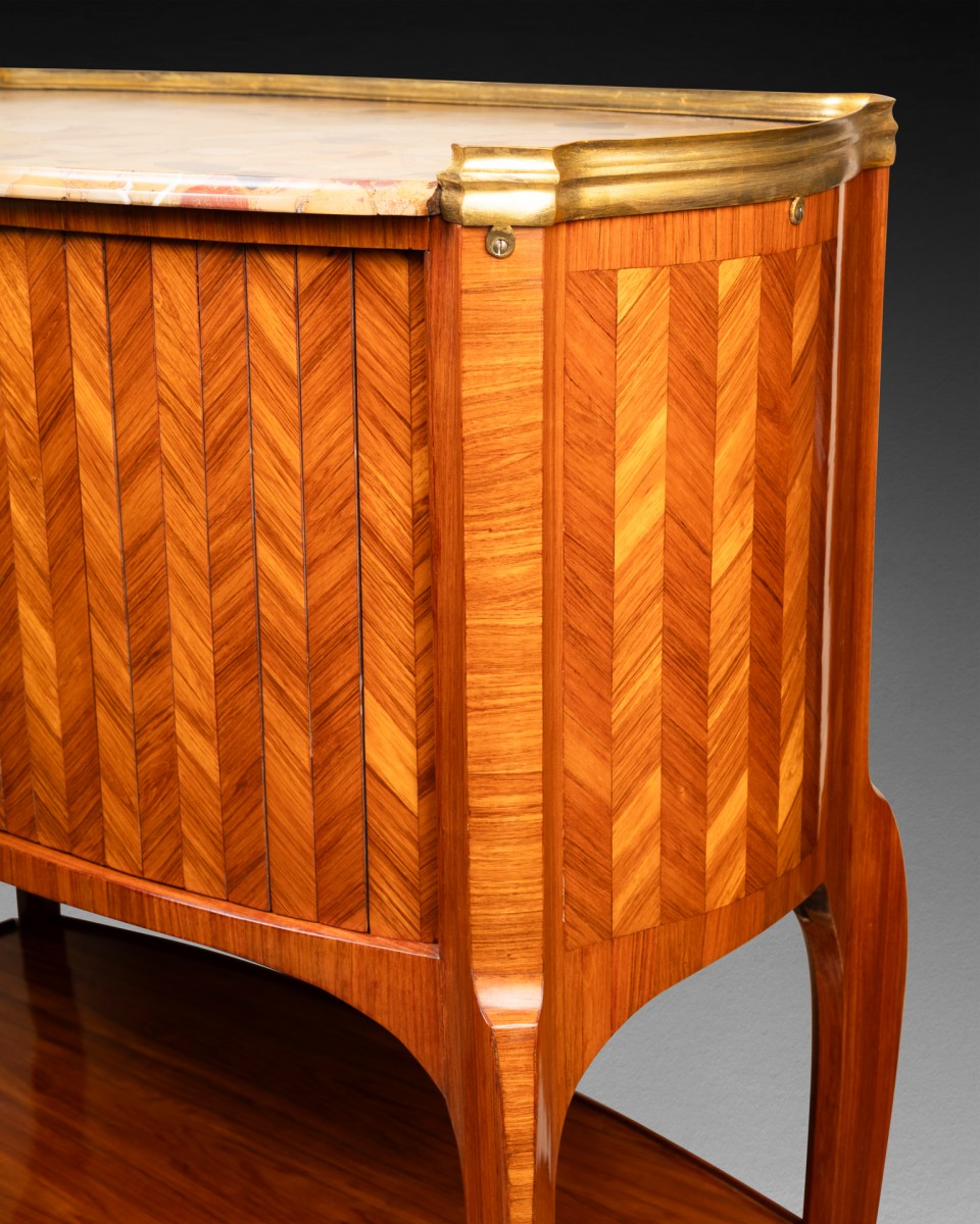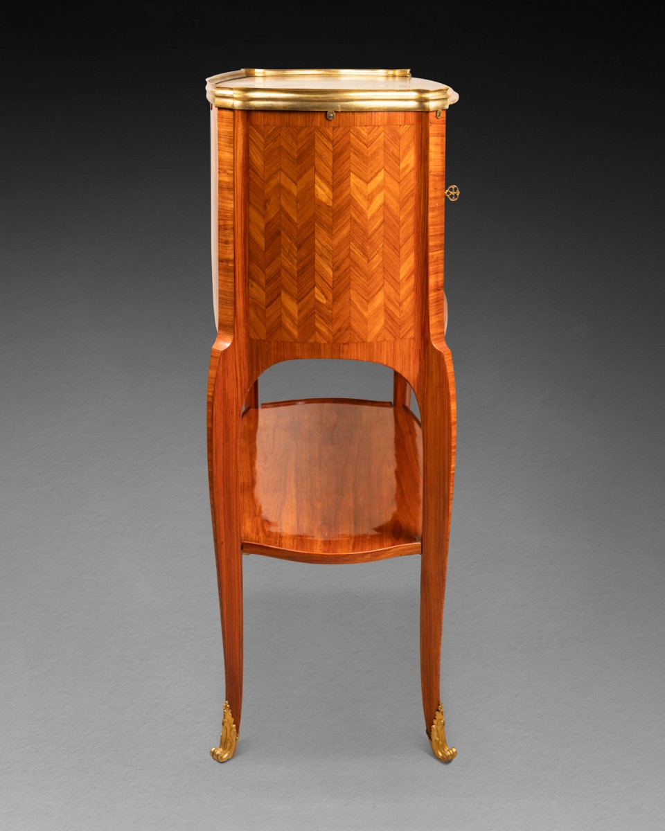 Il s'agit d'un meuble composé, en partie supérieure, d'un tambour oblong plaqué d'une marquèterie de chevrons verticaux de bois de rose, et s'ouvrant en façade par un rideaux de lamelles plaqués de chevrons de bois de rose. Le meuble repose sur quatre pieds cambrés, réunis par une tablette plaquée du même bois de rose. Il découvre en partie inférieure des casiers munis de cinq tiroirs dont deux découvrant une tablette garnie de cuir formant écritoire. Le meuble est coiffé d'un marbre brèche d'Alep ceint d'une galerie de bronze doré.