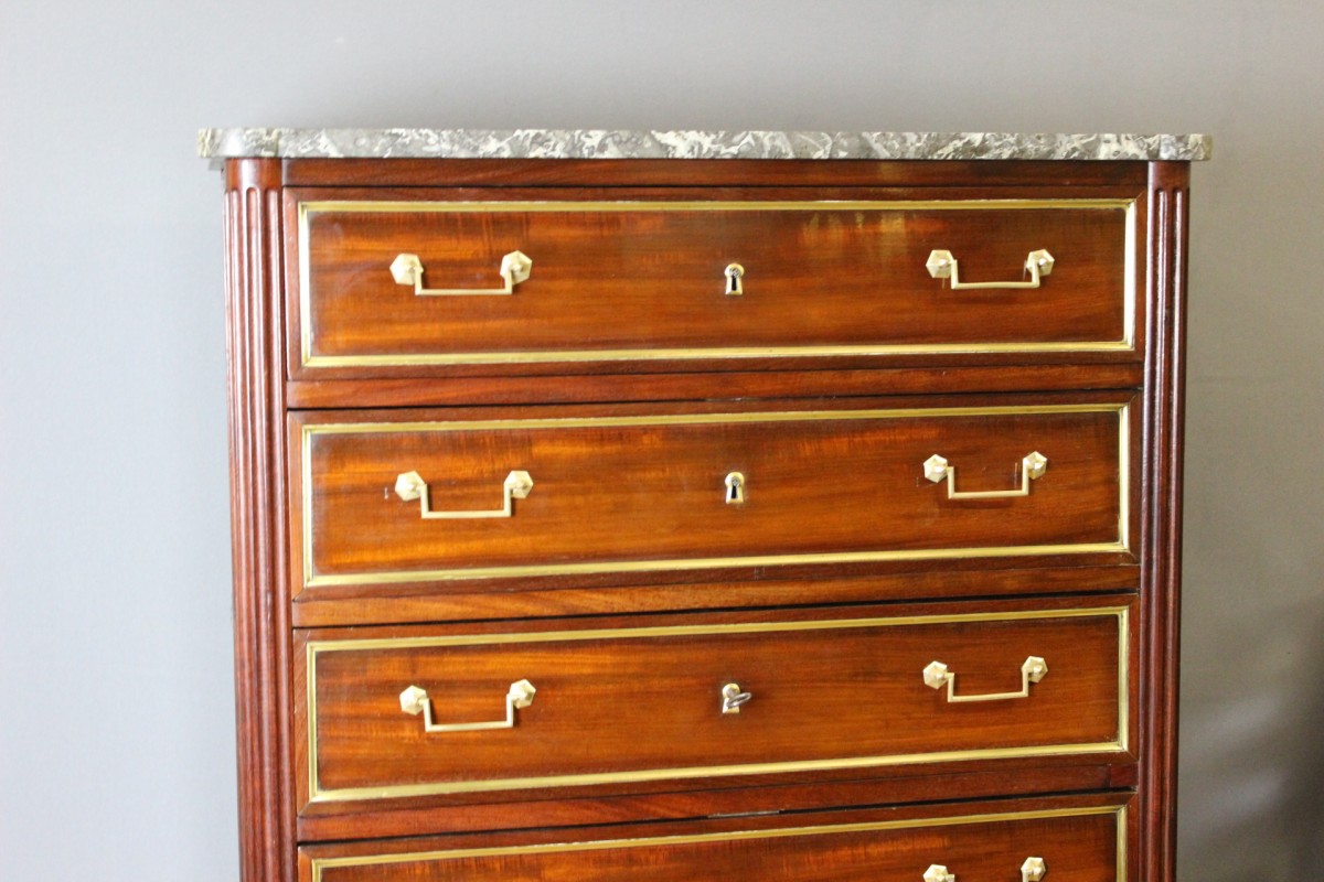 Semainier d'époque Louis XVI en acajou et placage d'acajou , il ouvre par six tiroirs dont un double , il repose sur quatre pieds toupies , encadrement de baguettes laiton sur les tiroirs , dessus de marbre gris Saint Anne d'origine , finition vernis , ensemble en très bon état