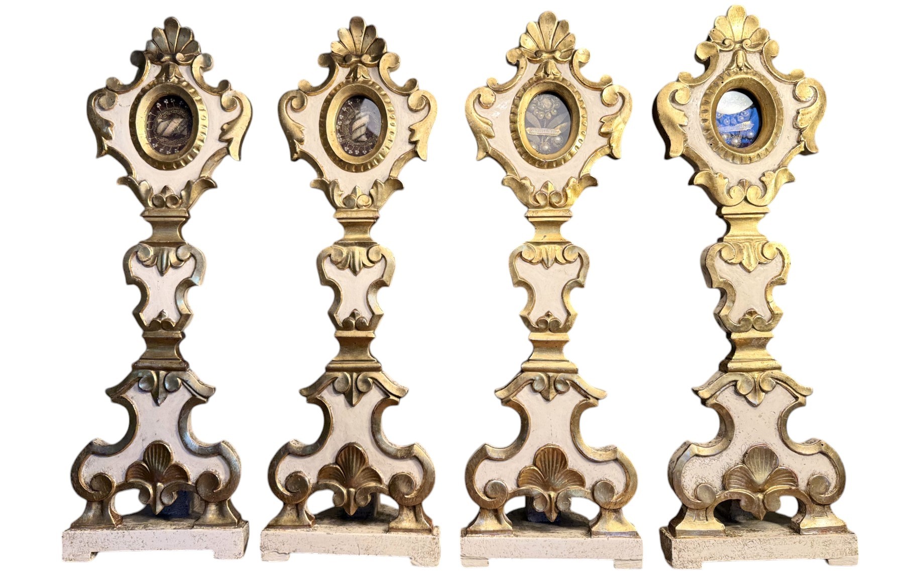 En bois alternativement blanchi et doré et sommées d’une palmette, nos monstrances reçoivent en leur centre des reliques ex-ossibus ensachées des Saintes Dorothée, Margareth Vierge, Béatrice Martyre, et de Saint Honoré. Le phylactère de ce dernier saint est peu lisible.