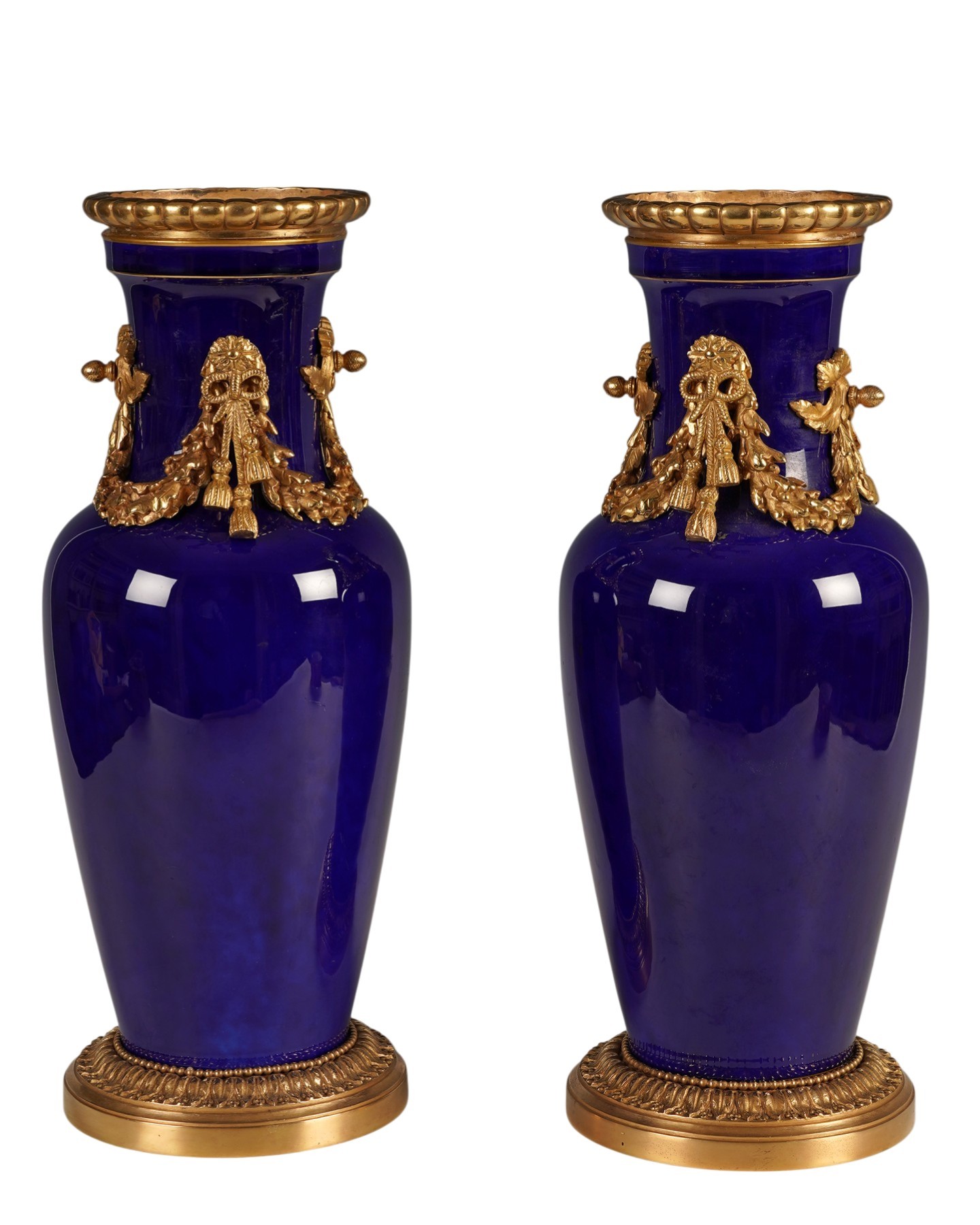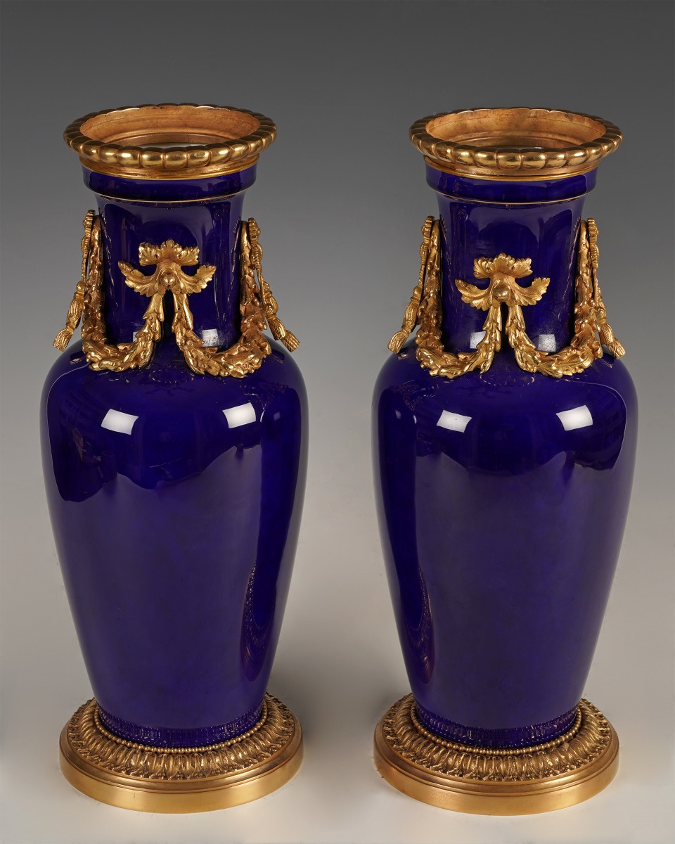 Cette paire de vases de forme balustre en porcelaine dite « bleu de Sèvres » ou « gros bleu » est ornée d’une élégante monture en bronze ciselé et doré composée d’un col à large mouluration godronnée, d’appliques latérales figurant des chutes de laurier et de rubans noués, suspendues à un bouton feuillagé et repose sur un piédouche circulaire, légèrement évasé, ceint d’une frise de feuilles d’eau stylisées.