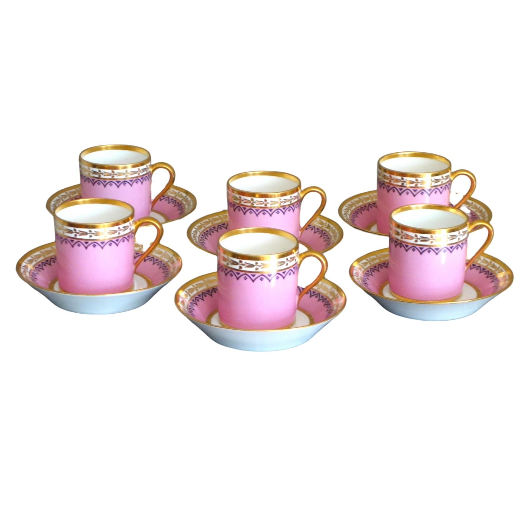 Service à café composé d'une suite de 6 tasses à café litron et leur soucoupes en Porcelaine de Sèvres. Beau décor de style Egyptien sur fond rose dit "hortensia" à décor de frises de fleurs de lotus stylisées or sur fond blanc encadrée de filets dorés. Au centre de la soucoupe, une rosace de fleurs de lotus stylisées. La tasse et la soucoupe portent au dos la marque de la Manufacture de Sèvres, le double L de Louis XVIII, la Fleur de Lys Royale et le nombre 21 pour l'année 1821. Inscrit en doré la marque du doreur.